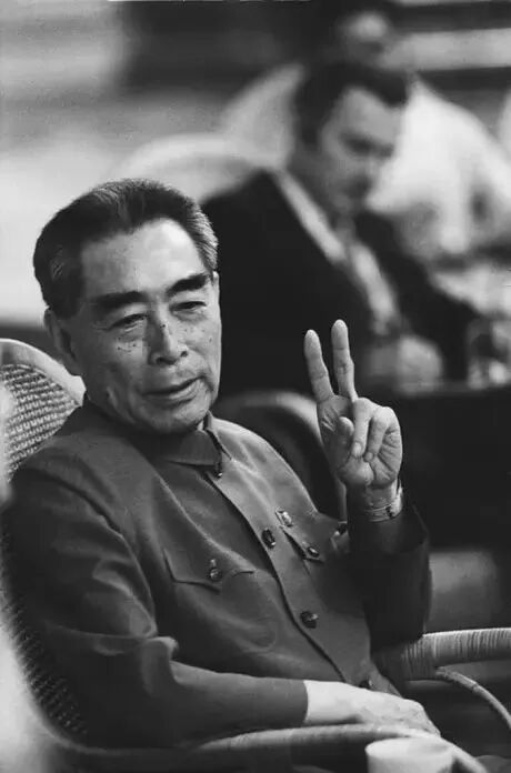 ▲ 1971年,周恩来总理在和法国前教育部长聊天时伸出两根手指说:“我在法国只学到了两样东西,一个是马克思主义,一个是列宁主义。”这个场景被马克迅速抓拍了下来,成就了这幅经典的肖像作品。