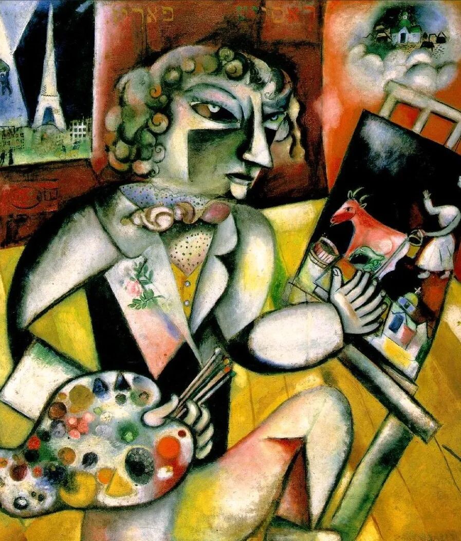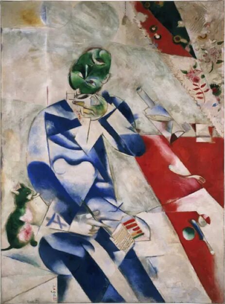 1911年,他在独立沙龙画展上展出作品,也作为立体派画家与格莱茨、梅占琪一道办展览。从这个时期的作品《有七个手指头的自画像》可以看出,夏卡尔在保留俄罗斯风物图景的因素同时采用了立体派的几何画法。画家的脸和身体被立体主义的分割平面弄得七零八落,占了大幅画面的背景再现了画家透过巴黎的窗子记起的维布切斯克家乡的幻象。