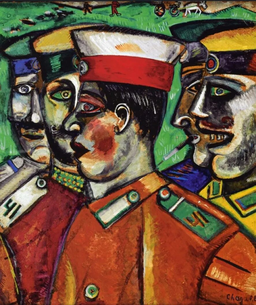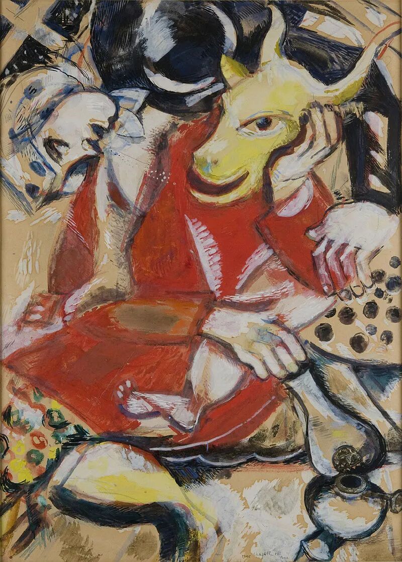 失意的画家重新捡起画笔,却发现诗意的淡紫色、深绿色、透明的兰色以及玫瑰红都不已再适合描绘那个被现实剥了皮的世界。为犹太剧院的大厅和休息室绘制壁画、负责某些戏剧的布景和服装设计,成为这一时期夏卡尔用以抵御外界征服的精神壁垒。