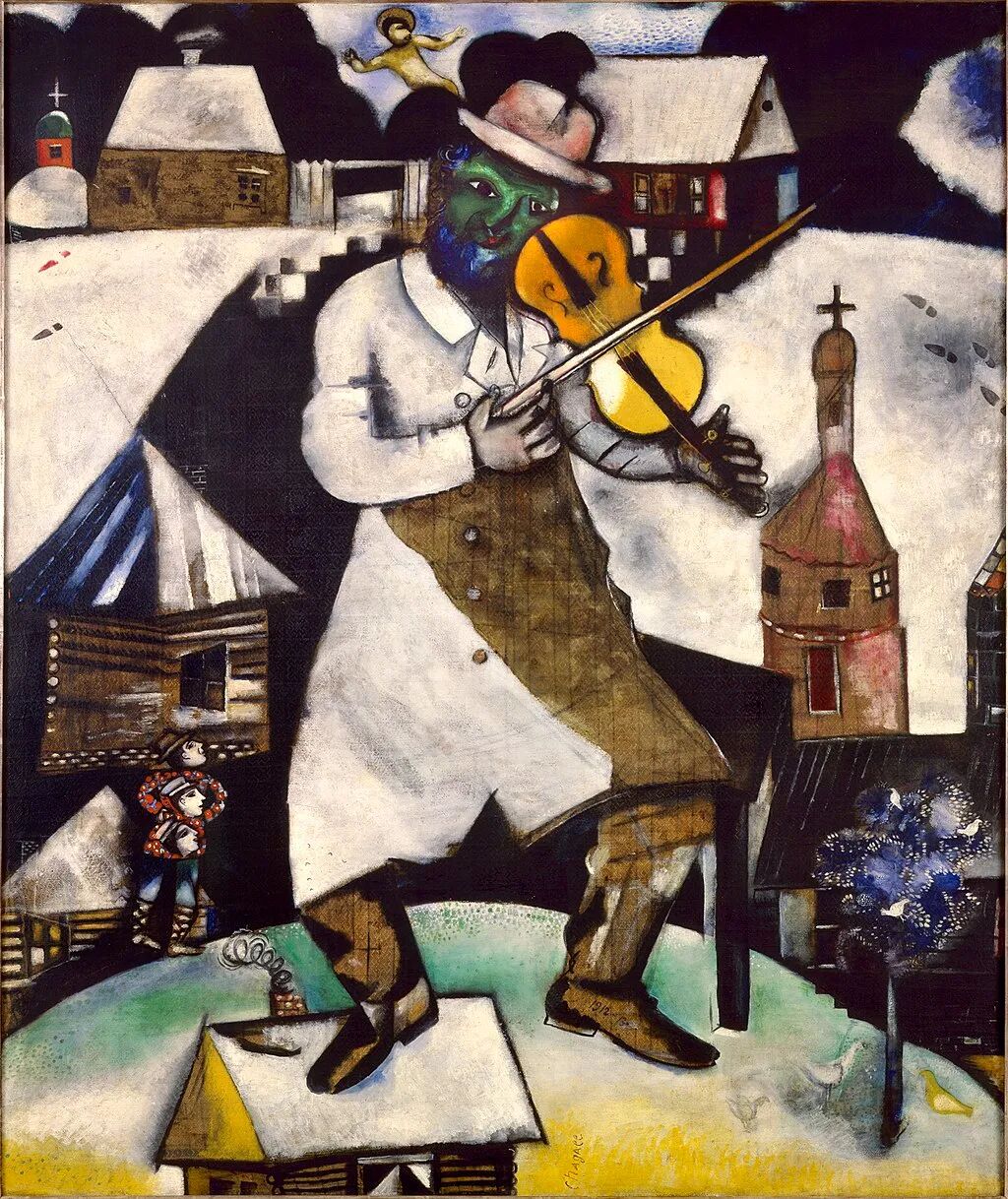 黑色的村庄,山谷里的紫丁香,白色的马匹、清晨开花的树、面目模糊的乐手、冰原上飞翔的鱼……遥远的俄罗斯气息开始浸透飘荡在巴黎夜空下那个失望、孤寂的灵魂。放弃询问的迷途者在回忆中发现了坦途——通往记忆与未来的归乡之路。思乡题材使失望的夏卡尔不经意间实现也许当时已经无关紧要的梦想。