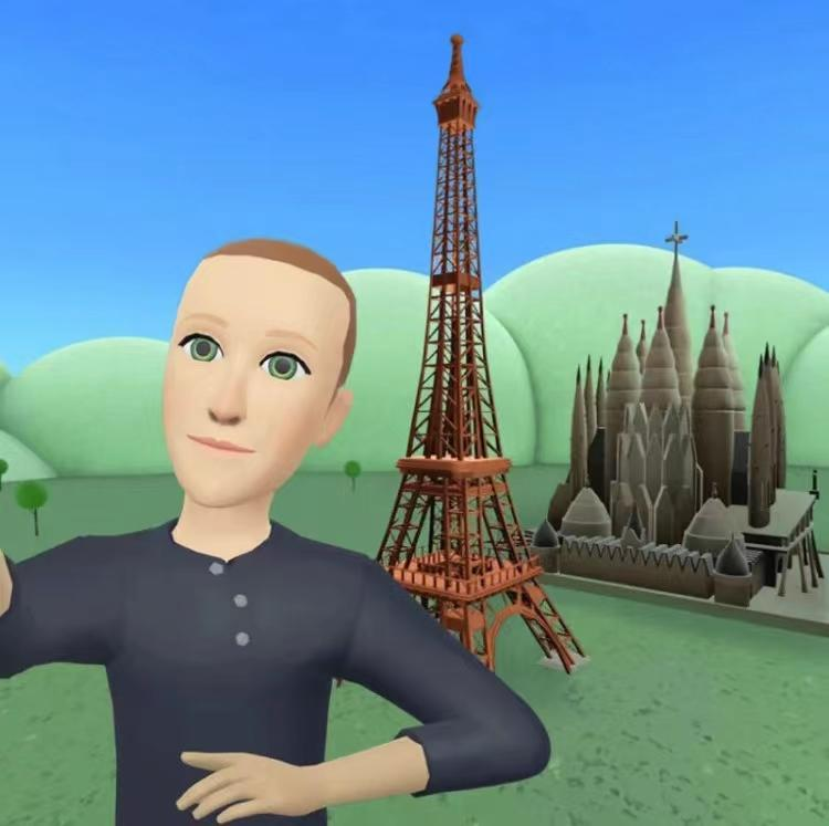 该公告附带了一张扎克伯格虚拟自拍,突出了Meta CEO的头像,但该头像面无表情且毫无立体感。除此之外,头像背景中的埃菲尔铁塔和圣家堂的一对不起眼、无比例的模型仿佛掉到了绿色的地平面上。