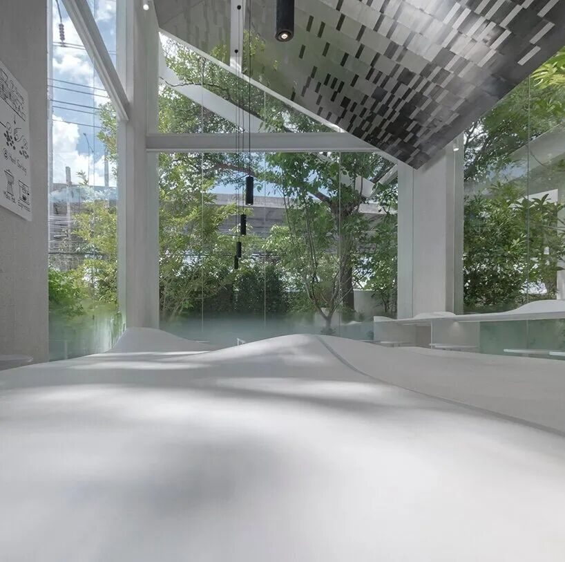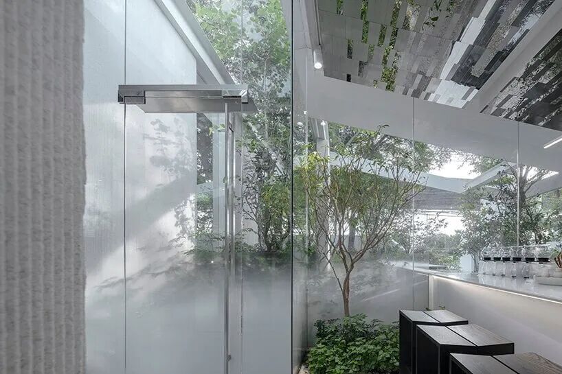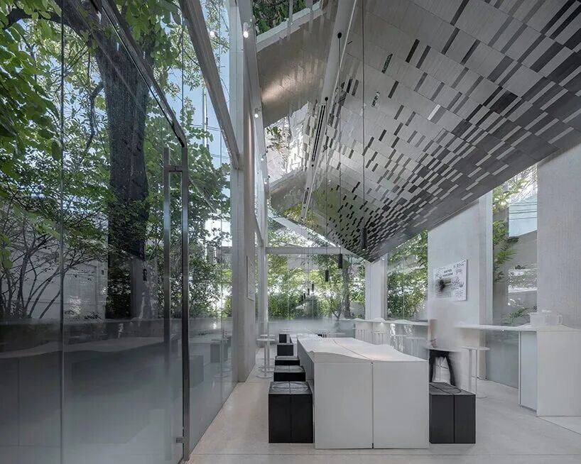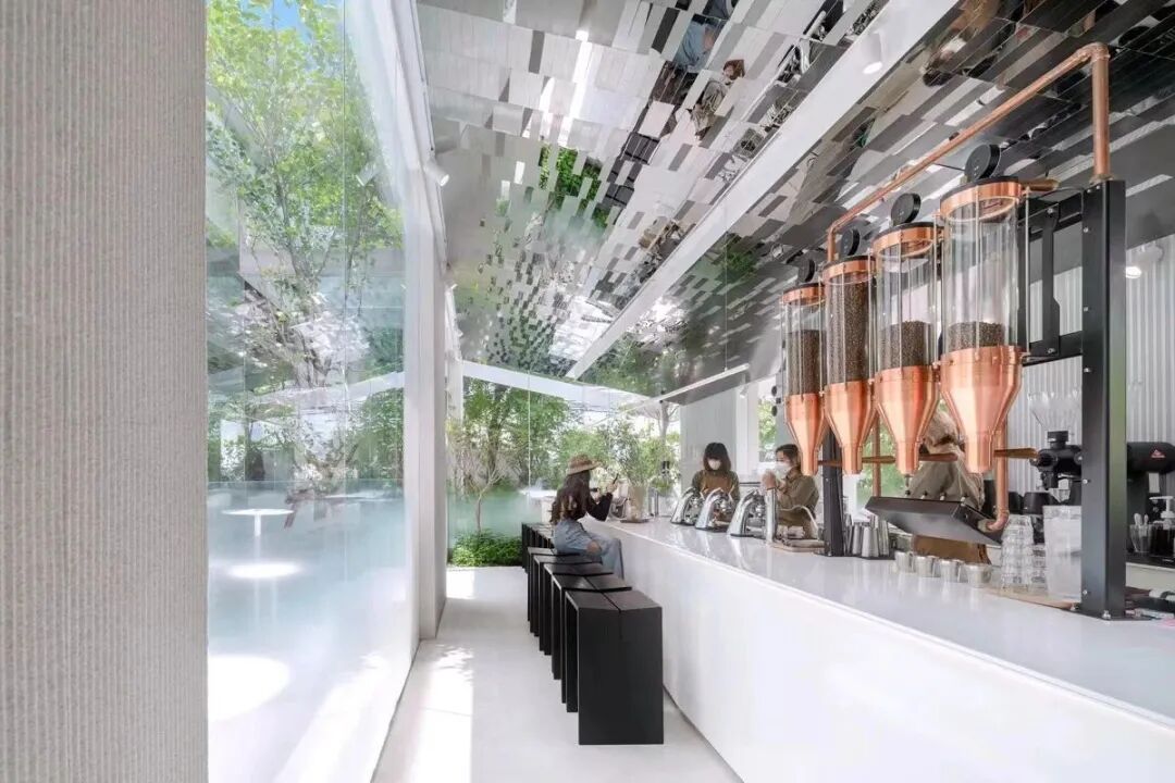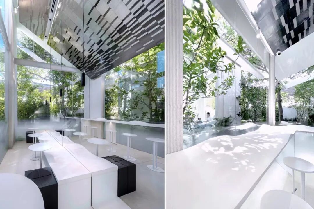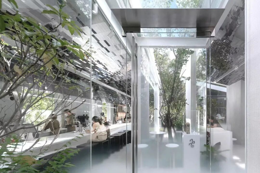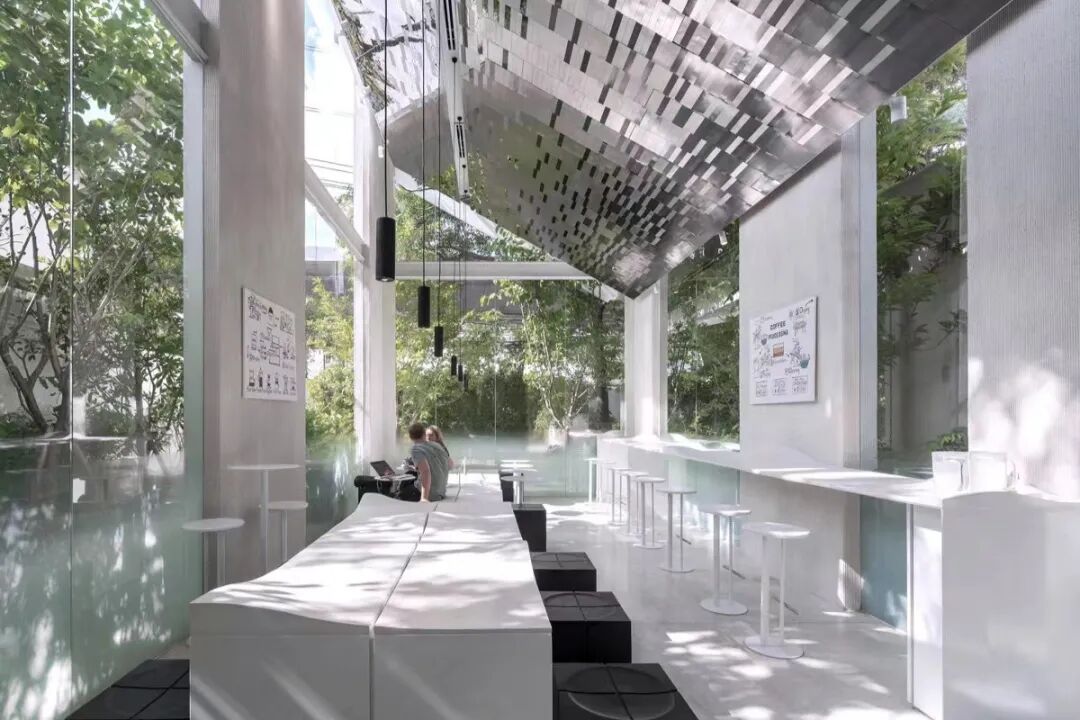 由于天花板上大量的反光玻璃和马赛克镶板使得户外景观室外景观流入咖啡店的内部,渗入了建筑体之间的缝隙,从而进一步模糊了界限。