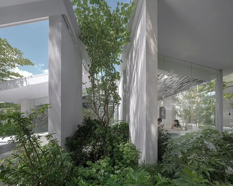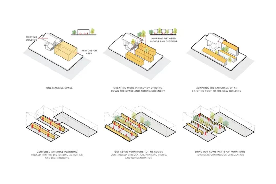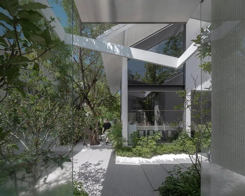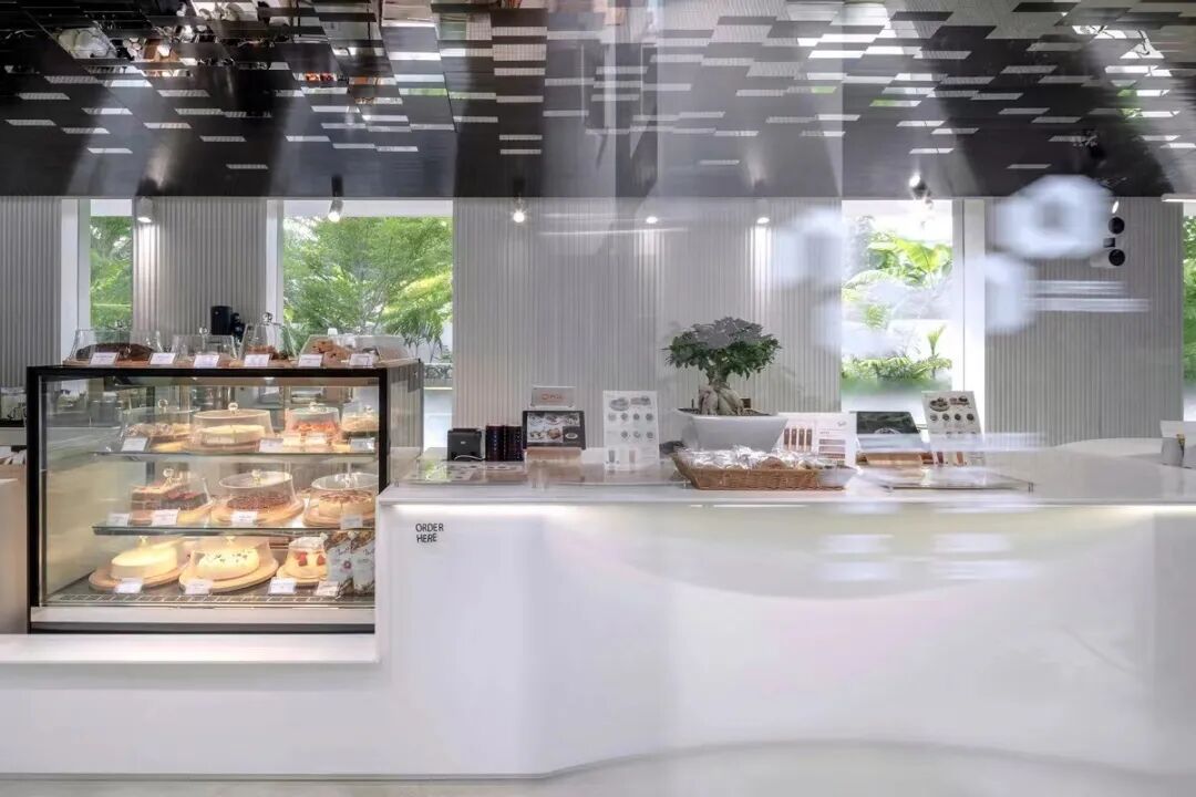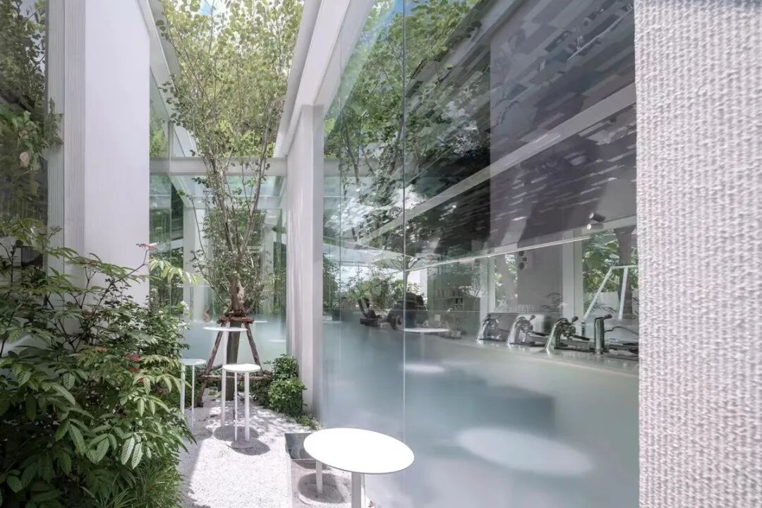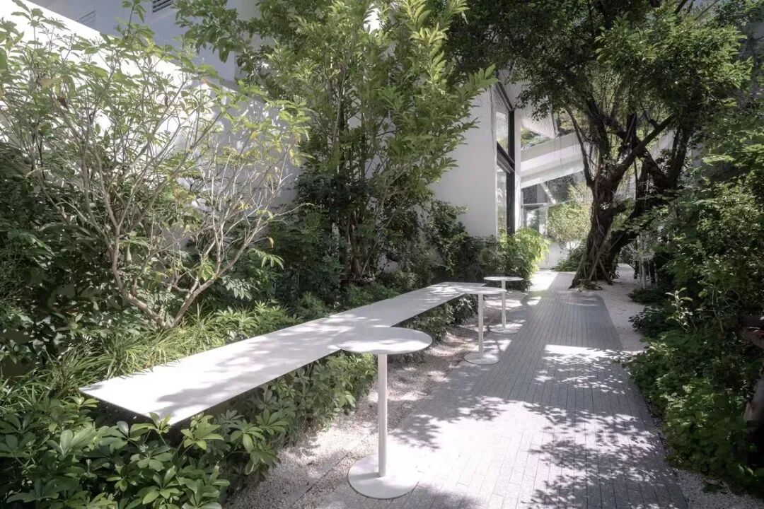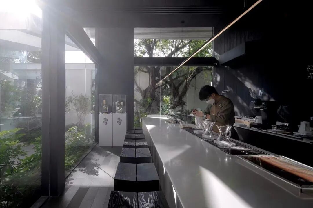 由于天花板上大量的反光玻璃和马赛克镶板使得户外景观室外景观流入咖啡店的内部,渗入了建筑体之间的缝隙,从而进一步模糊了界限。