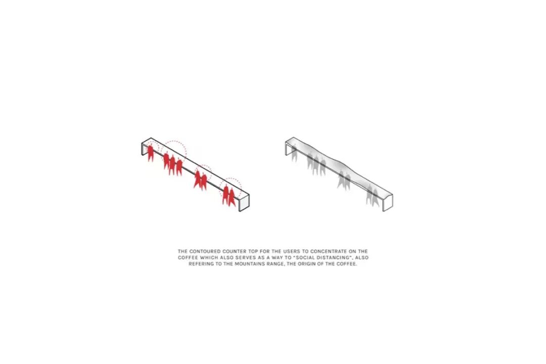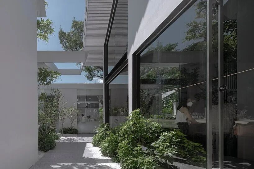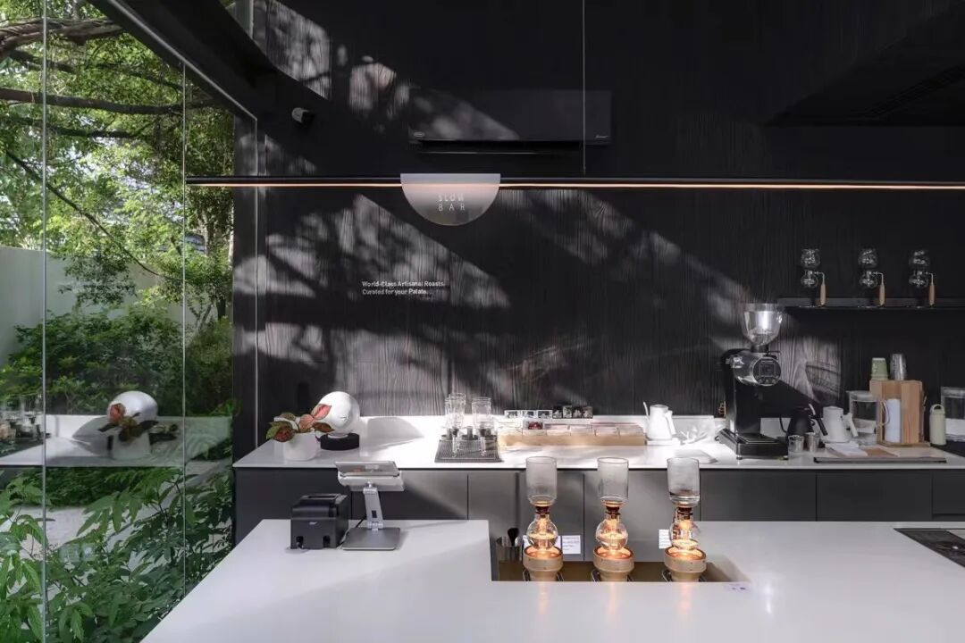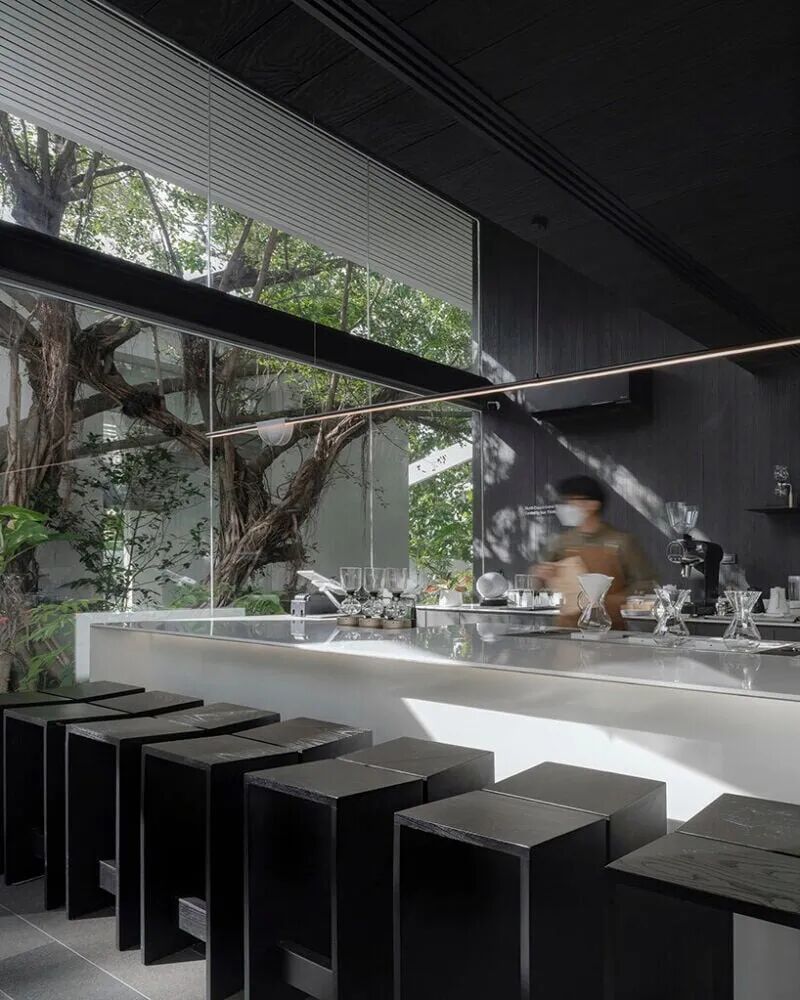 IDIN Architects将 NANA Coffee 内的所有建筑设计得简单而实用,并带有大胆的笔触。事实上,虽然团队确实用郁郁葱葱的绿色植物软化了建筑主体,但它仍然让位给大胆、倾斜的屋顶。这条屋顶线与现有建筑保持连续性,现有建筑延伸到 Speed Bar 和室内座椅所在的三个体量。对现有建筑的前部进行了有效改造,作为慢酒吧和服务区的一部分。