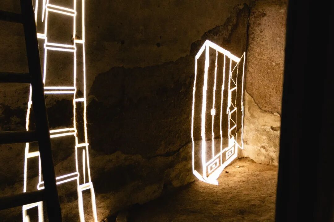 再往废墟中走,澳大利亚艺术家詹姆斯·塔普斯科特的作品《大约》带来了相当神秘的超现实感:这是一个被水雾缭绕的发光环形装置,圆环穿透石墙,将相邻的两座小楼连成整体。装置上有LED灯条和集成雾化喷嘴,水雾周期性地释放,让建筑在光和雾的点缀下展现出神奇的观感。