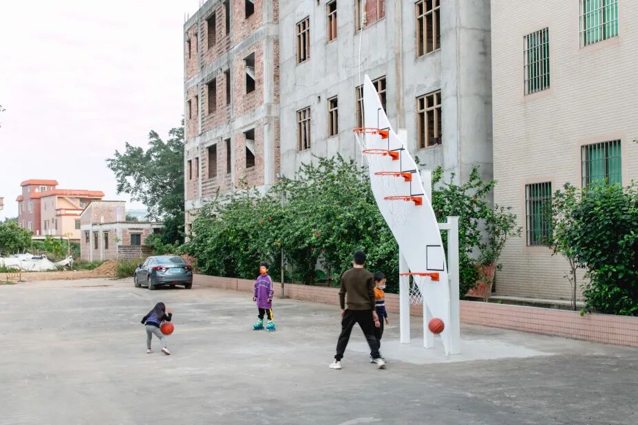 沿着进村的小路继续深入,沿路还会偶遇一个造型独特的篮球架,西班牙艺术家罗伯茨和彭斯以平沙岛的轮廓为造型设计了这个球架,上面装着5种不同高度的球框,就像这个装置的名称《人人皆赢家》一样,每个人都能够在这里获得投篮命中的喜悦。
