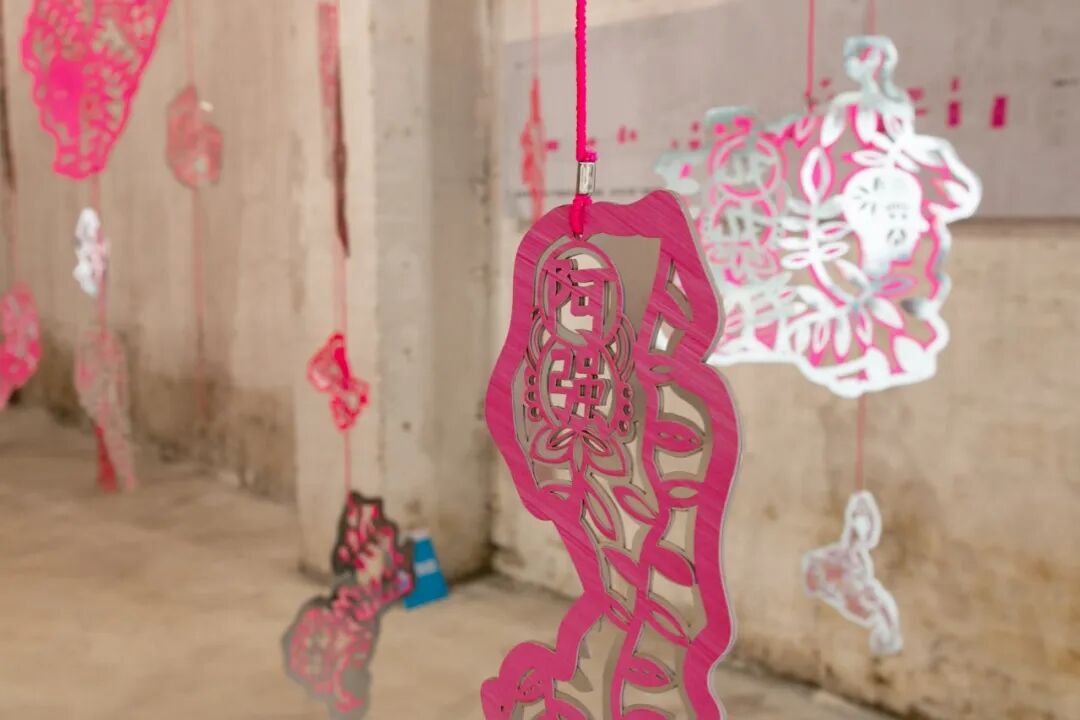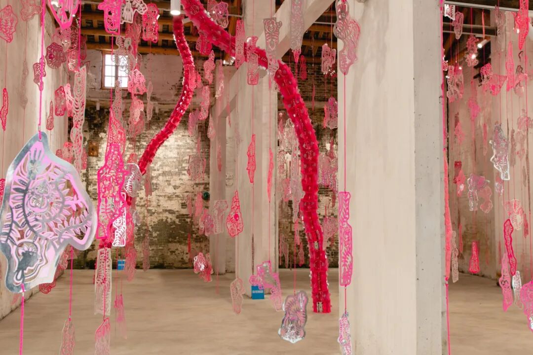这些用胶带勾勒的墙皮轮廓是艺术家陈粉丸的作品《阿墙》的一部分,在街上的一间屋子里藏着作品的完全体——房间里挂满了粉色的剪纸,还有两组从地上“生长”到屋顶、形如树干的装置。走进细看,剪纸上是一个个名字。