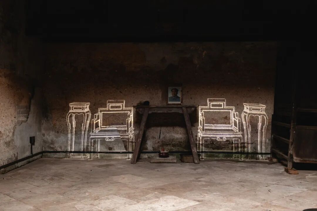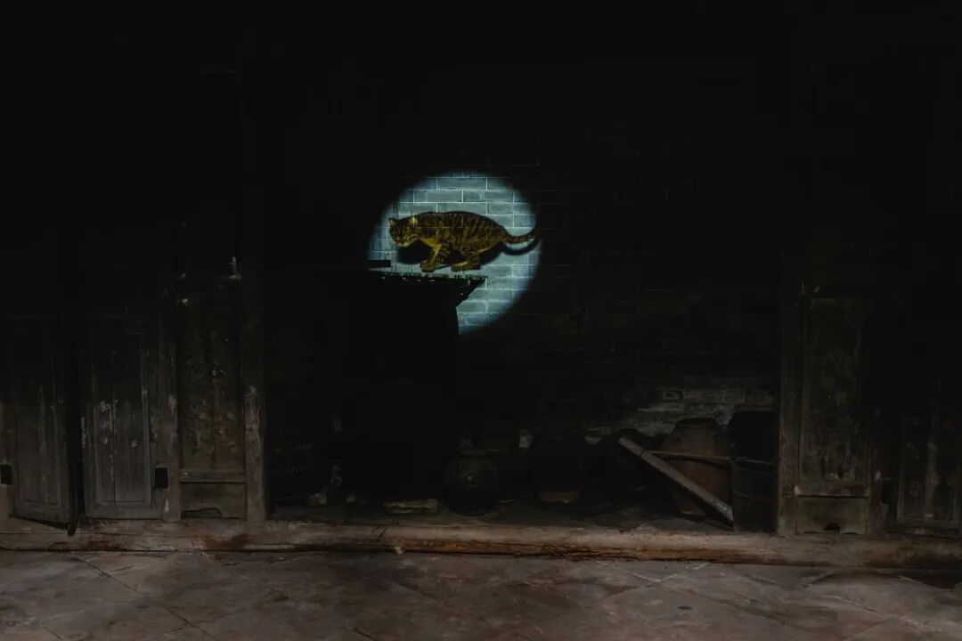 在松塘村,艺术家李洪波将一座建筑形态保存完好的老宅变成了一个盛放过逝去岁月的空间容器《旧时光》。通过投影,桌椅床柜等家具被复现于空荡荡的房间里,还原着昔日的生活场景。其中一间较大的堂屋还用投影生成了一只狸花猫,伴随着留声机里广东地方戏的唱腔在房间里跳跃。