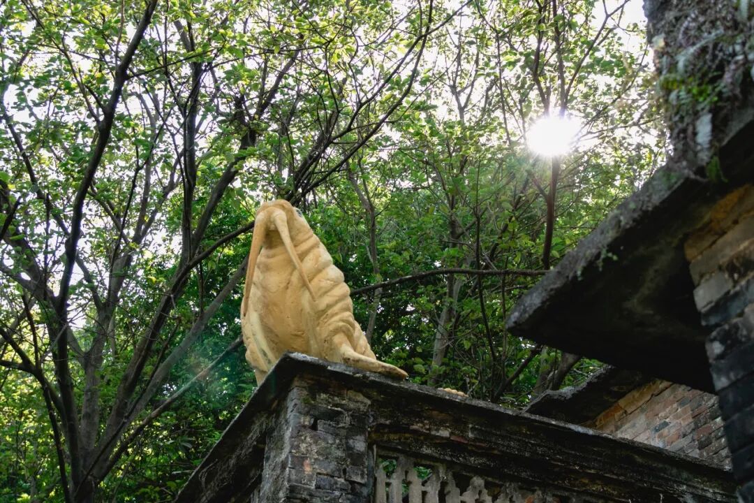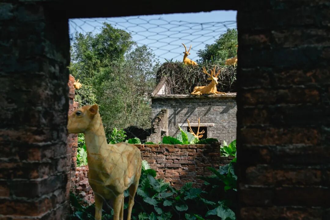 走进这片凝固的历史,废墟和植物编织的密林中原来藏着许多动物雕塑,从草丛到树梢再到房顶,动物们仿佛是在这里开派对。这是邬建安以华南代表性野生动物豹猫为主角创作的作品《豹猫和它的朋友》。据艺术家的介绍,这个作品构想了一个末日大洪水后的世界,豹猫邀请它在方舟上认识的朋友们来到自己的故乡,一个无人的古村。