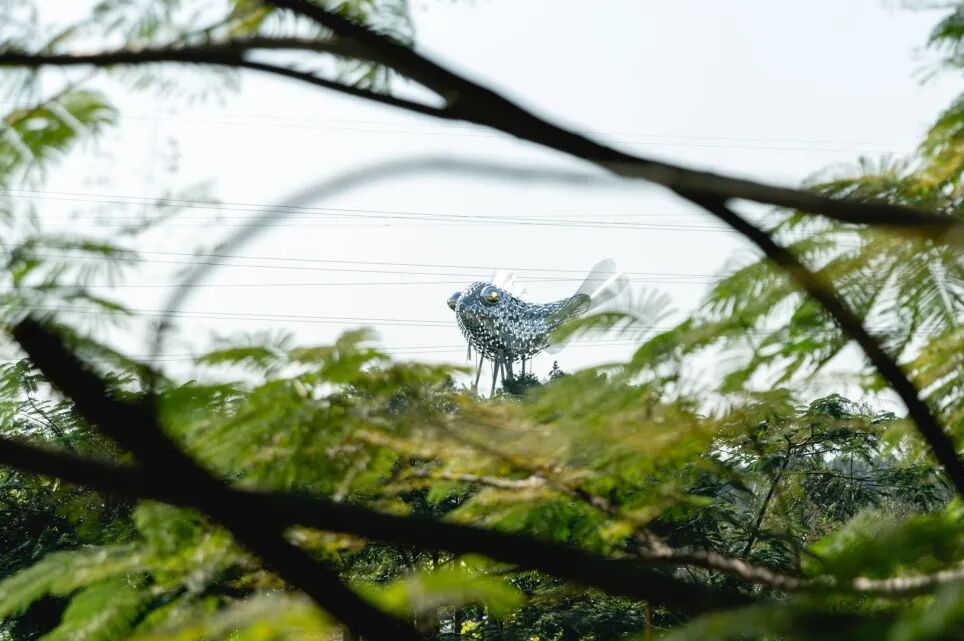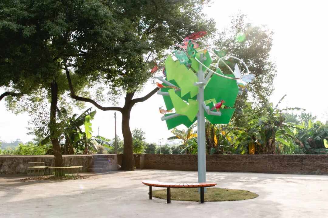 在渔耕粤韵,连片的桑基鱼塘的中央,一条硕大的金属鱼卧在了一颗大榕树上,树下的跷跷板还会随着人的使用,带动树顶鱼身的摆动。鱼眼在晚上会投射出光束,随着跷跷板的起伏来回巡视着这片鱼塘。