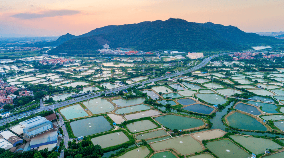 南海西樵镇的桑基鱼塘,远方是西樵山 / 图源网络
