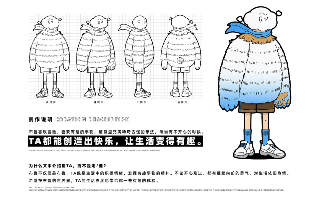 今天分享的这个MCITY盲盒形象,主人公布鲁喜欢冒险,喜欢有趣的事物,脑袋里充满稀奇古怪的想法,每当有不开心的时候,TA都能创造出快乐,让生活变得有趣。而采用TA代替她/他的称呼,是因为布鲁不仅仅是布鲁,TA像是生活中的积极情绪,发掘有趣事物的精神。不论开心难过,都有继续向前的勇气,对生活依旧热情。希望在布鲁的世界里,TA的生活态度也带给你一些有趣的体验。
