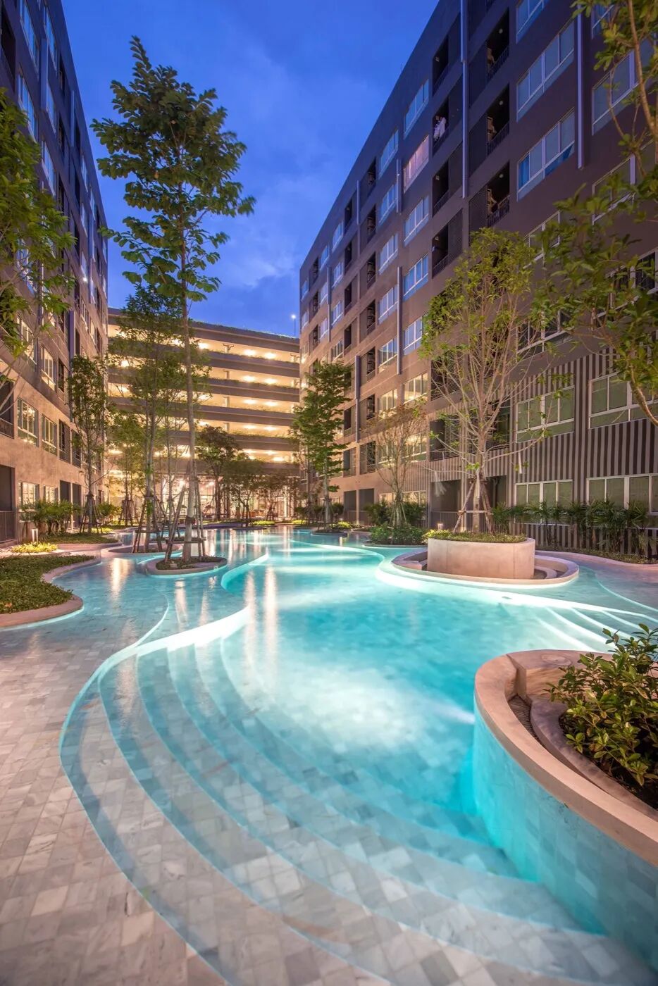 Landscape architect turns to constraint to a unique selling point for project with access pool for the residential rooms downstairs, providing a unique experience similar to a resort stay. The privacy of the rooms can be maintained from the common area. By using the design with a shallow pool area, greenery to create a personal space for privacy screening. Having a long-access pool could increase value and demand to the ground floor units, which usually higher-floor units are more preferred.