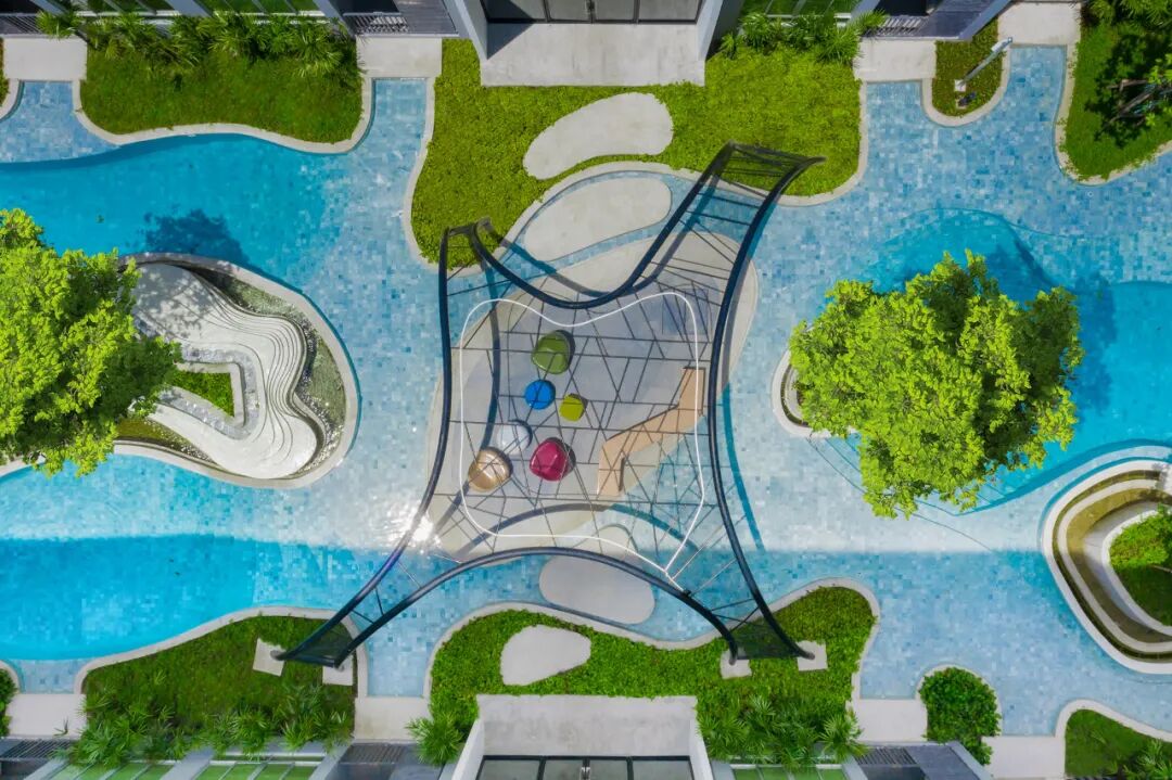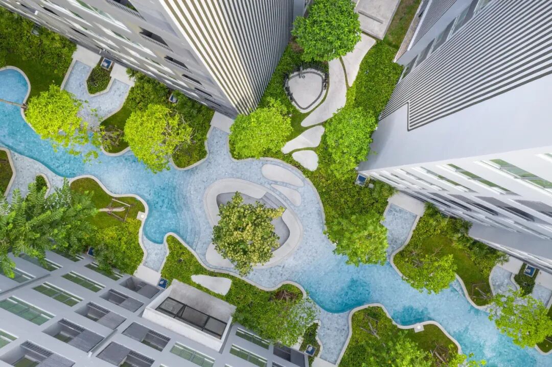 景观设计师将项目场地的限制转化为项目亮点,为低楼层的住宅房间提供了一个类似于度假酒店的独特体验,并通过浅水池设计和绿色植物营造出一个隐蔽的私人空间,保持房间的私密性。公寓内拥有一个可长时间使用的泳池可以增加公寓楼栋的价值和需求,通常高层单元更受欢迎。