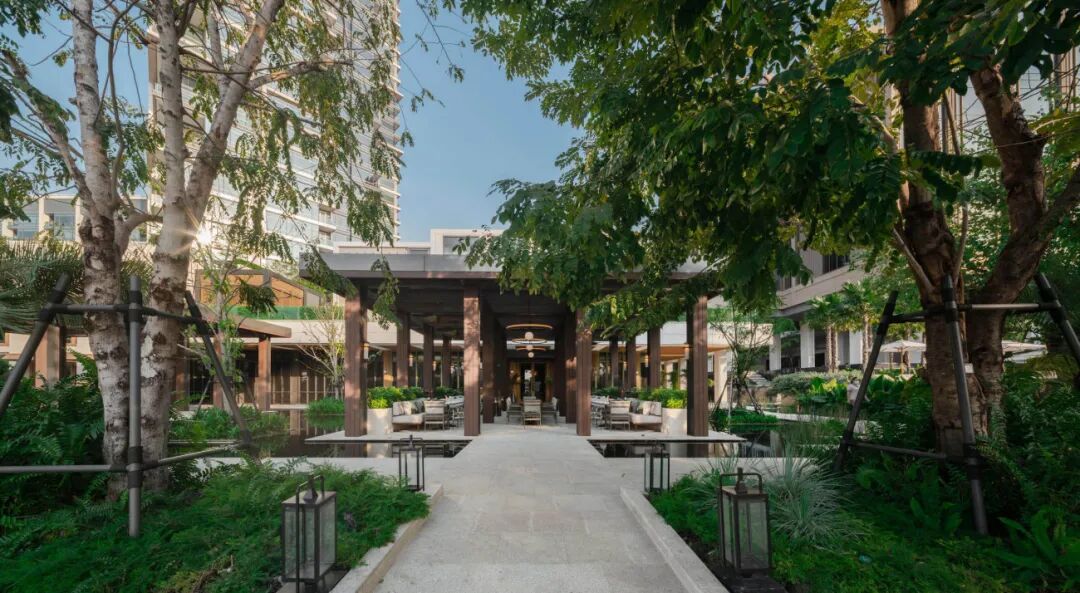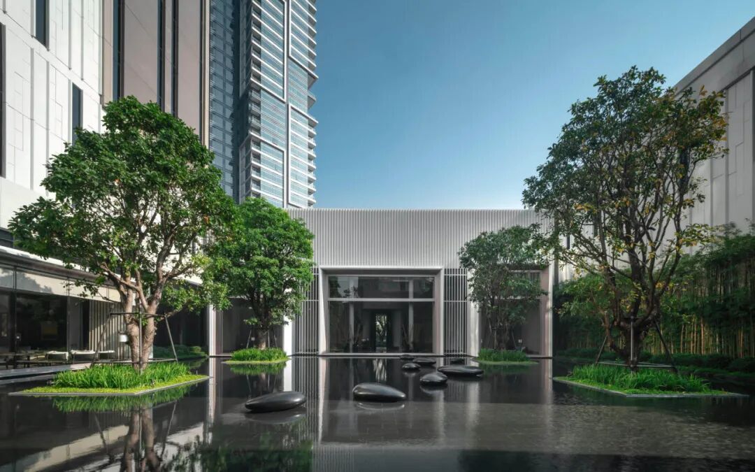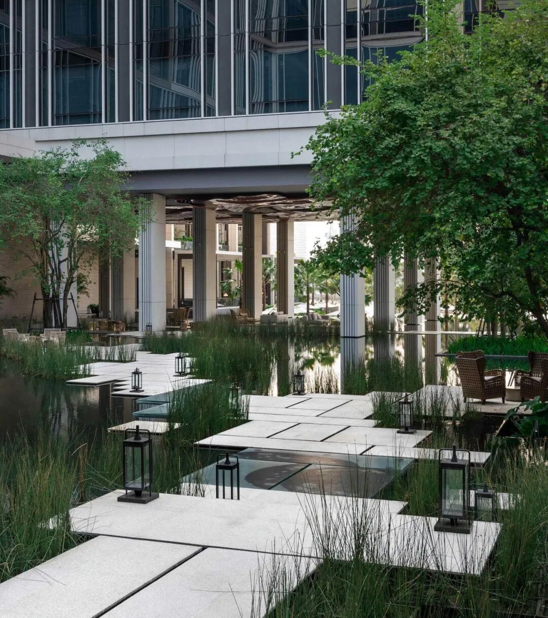 曼谷四季酒店的中央庭院由精心挑选的观叶树、小型树种以及大片的具有温馨舒适质感的水生植物组成,戏剧性地展示了从休息室到河流的迷人镜面效果,营造出宁静的氛围。