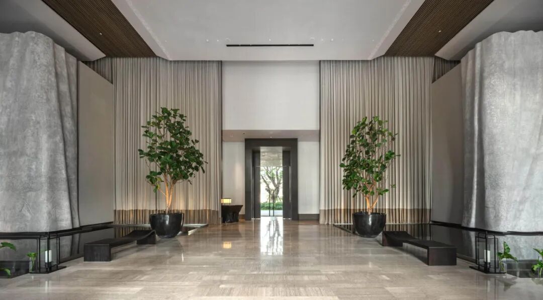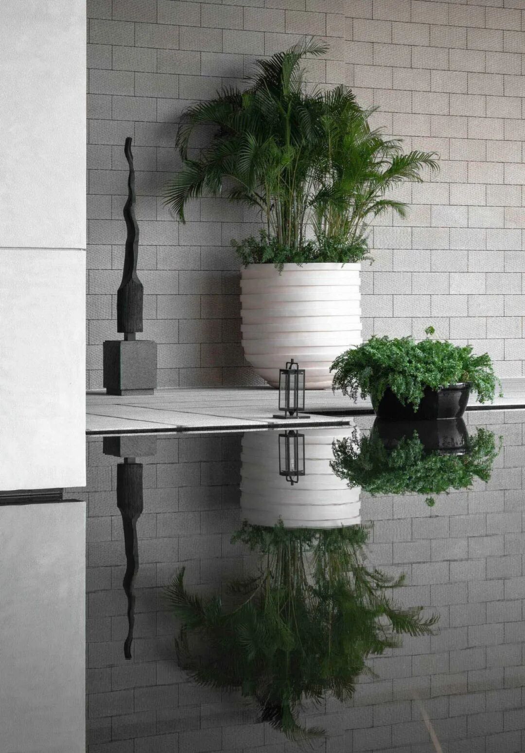 从室内延伸至室外的镜面水景交织在一起,到达庭院以宽敞的水道及其戏剧性的反射效果为特色,打造了一段迷人的河畔体验。一系列雕塑环绕着印度橡树,成为周围功能空间的焦点。