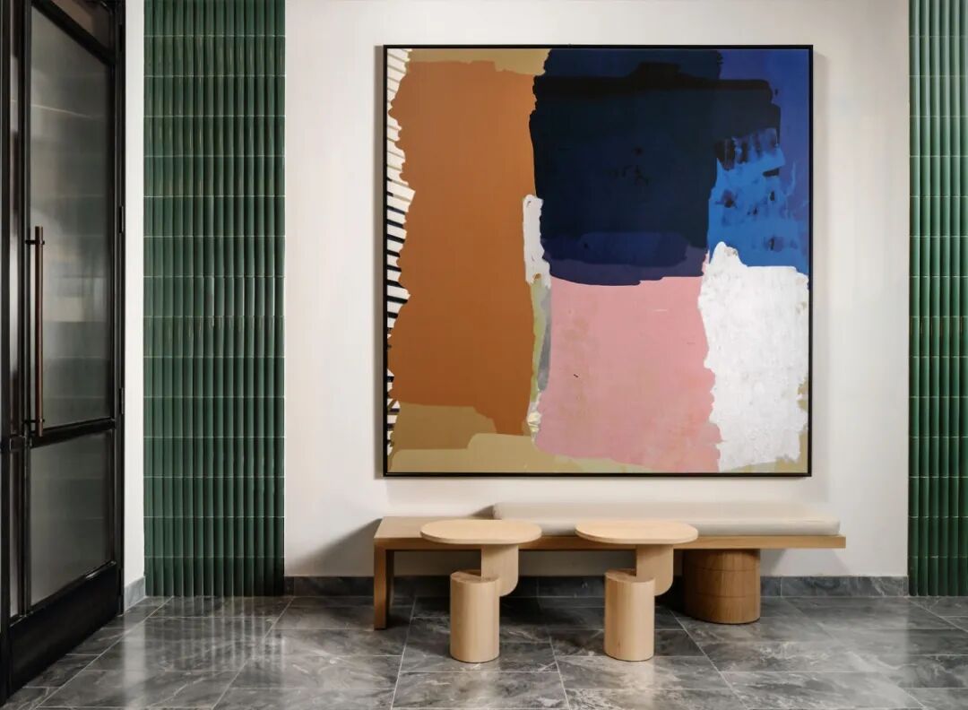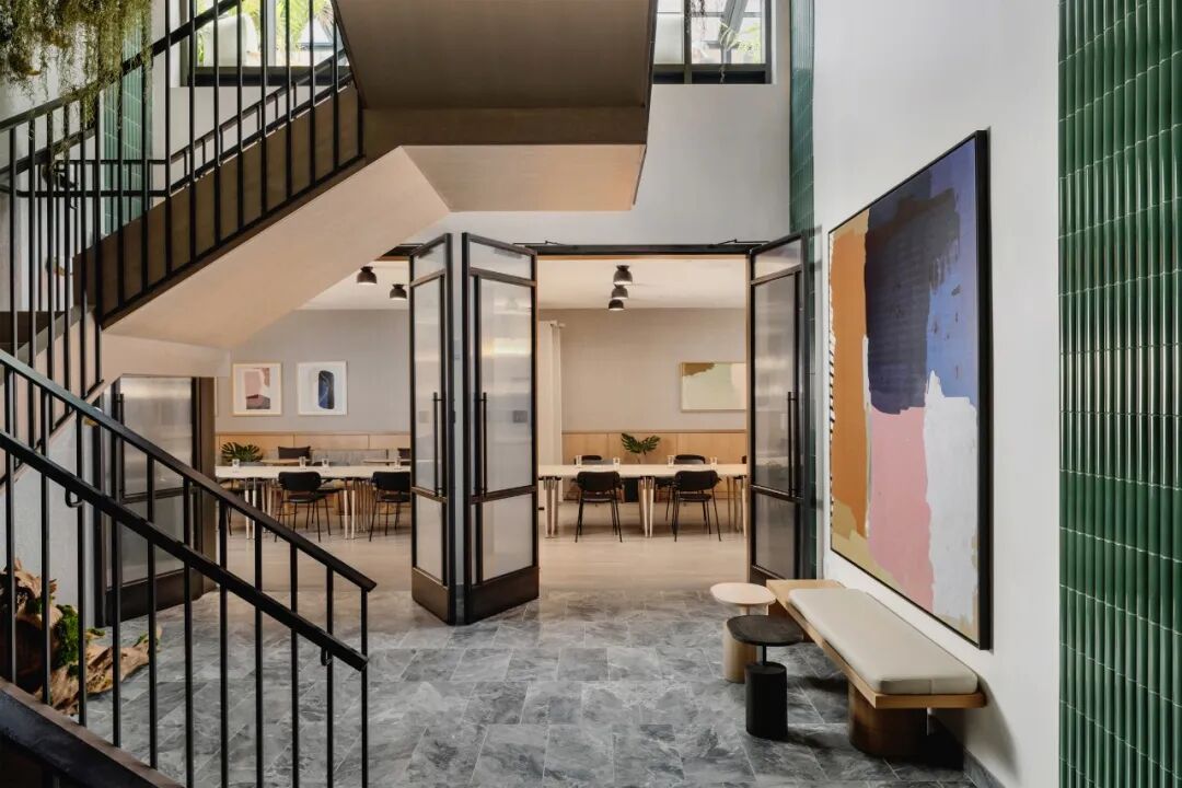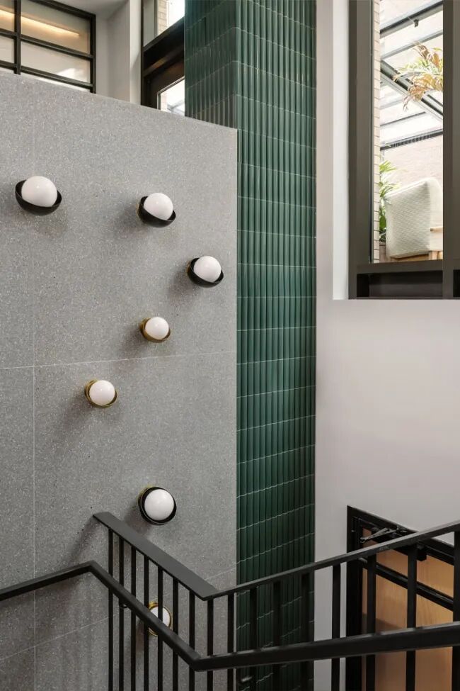 健身房与会议中心设在地下,设计师用墨绿色瓷砖和灵感来自纽扣的壁灯做视觉衔接,并搭配用色大胆的抽象画作点缀,同时带来时尚和复古精致的既视感。