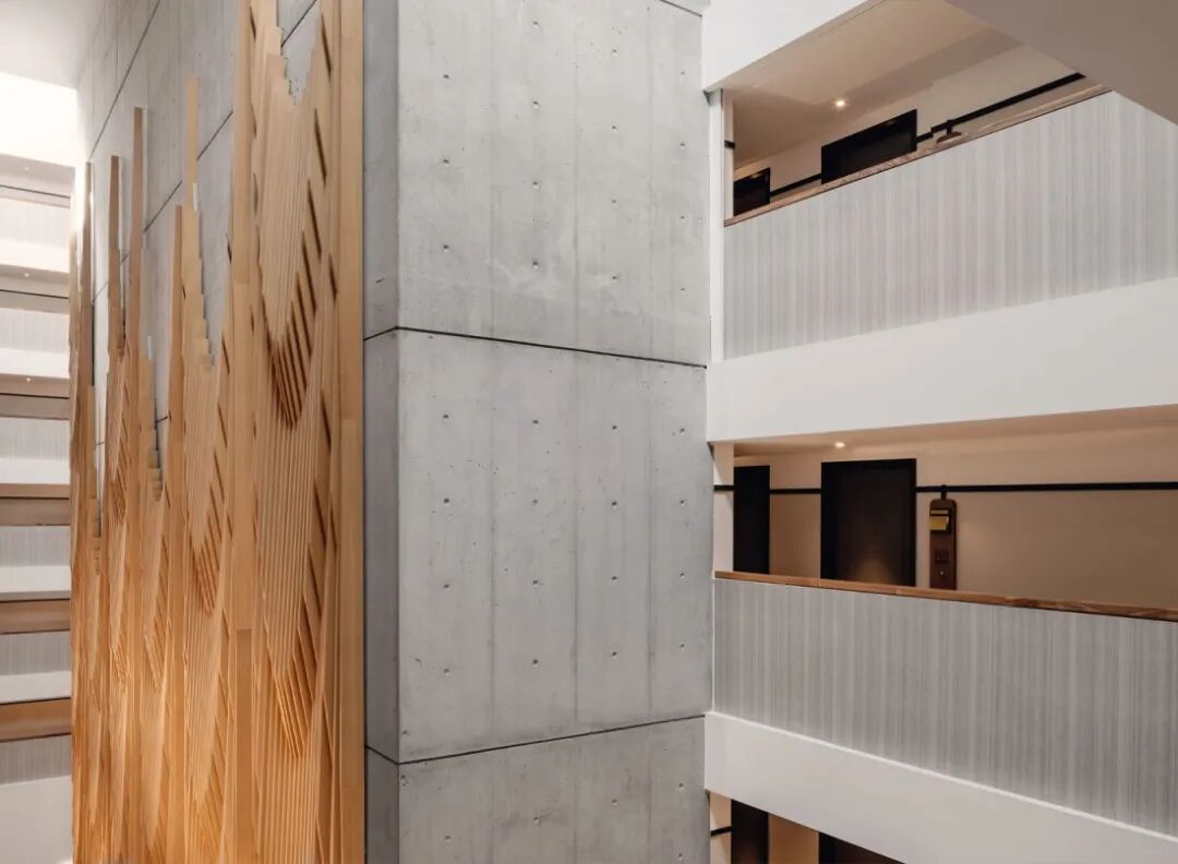 从俯瞰中庭的房间外的走廊也可以看到木饰面装置。“看到人们的反应很有趣,因为它太出乎意料了,”Davis 说,“我们努力用经得起时间考验的美丽材料创造空间。”