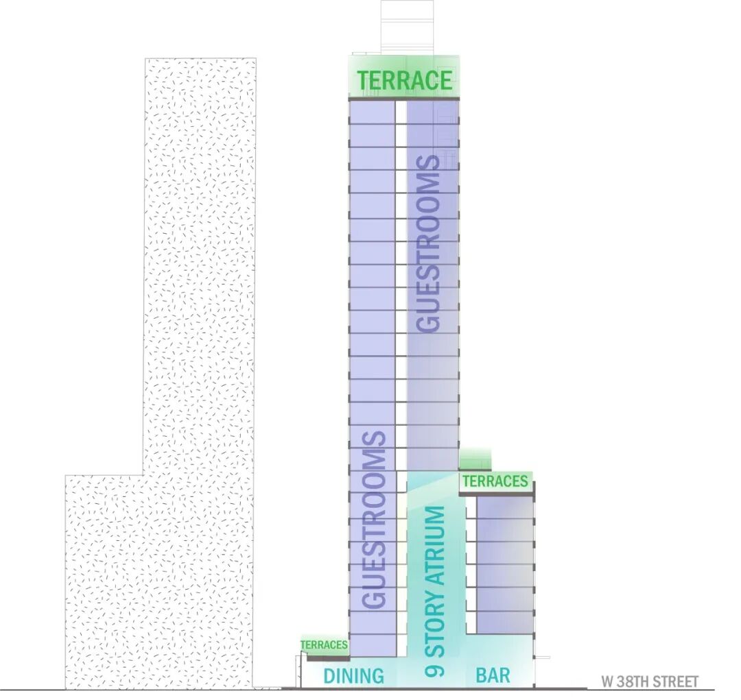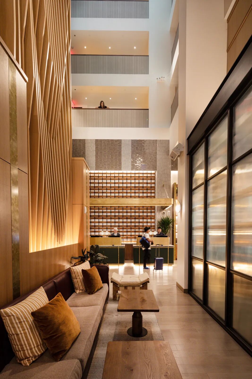 酒店一共 26 层,位于第九大道和第 38 街交汇处,时代广场和哈德逊广场之间。Marvel Architects 团队表示,其设计灵感来自纽约的街区,同时利用特殊的砖块细节为建筑赋予现代气息。