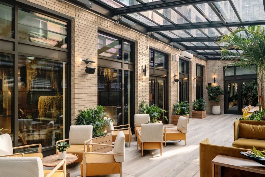 其露台部分的三面则被玻璃包围,通过郁郁葱葱的绿植和顶部玻璃天花的搭配,令人想起四季如春的温室,提供了一个明亮的用餐环境。 除此之外,酒店的 26 层屋顶拥有一个屋顶餐厅,从这儿往南望可看到著名的 New Yorker 酒店,东北面则是时代广场。