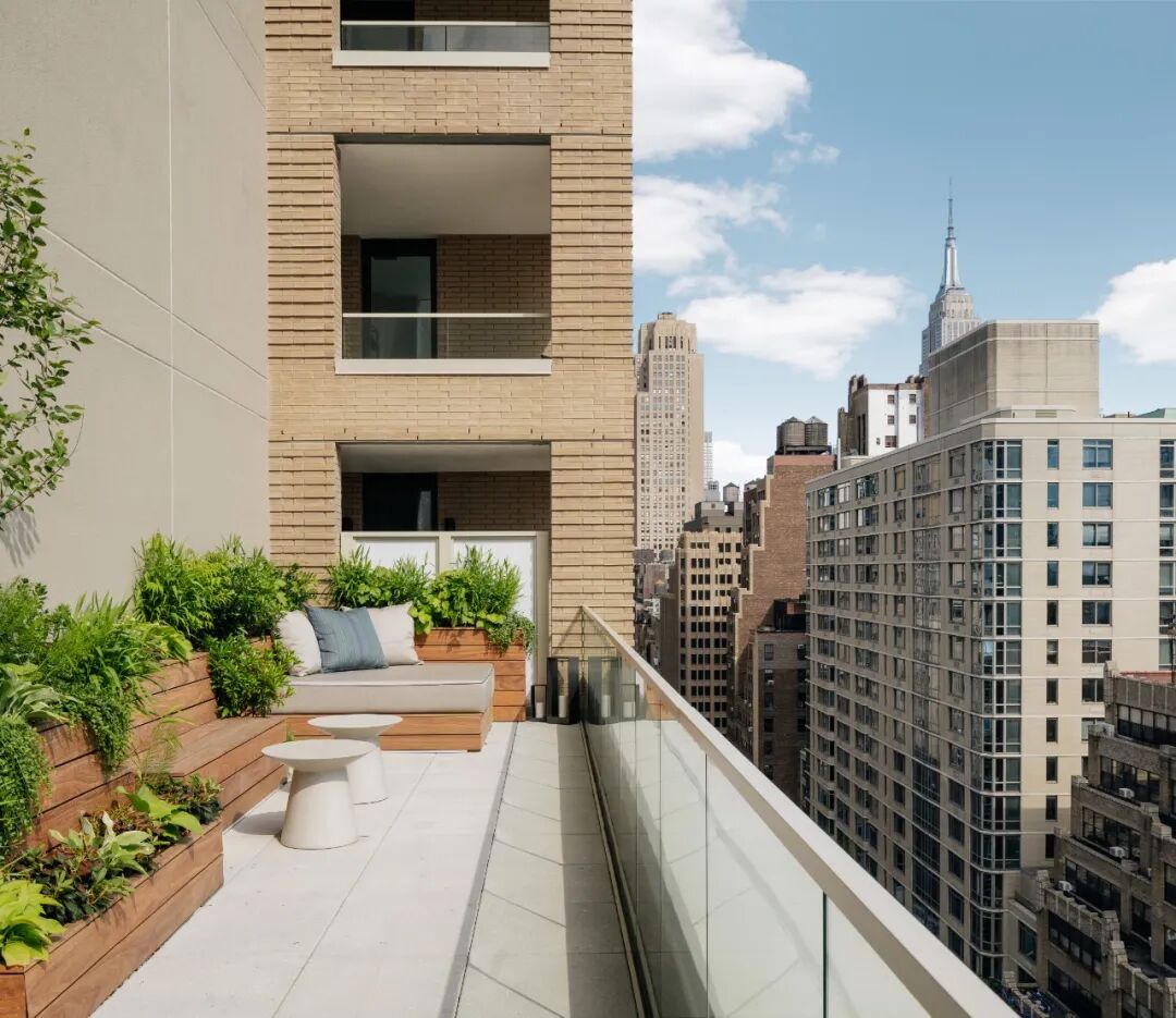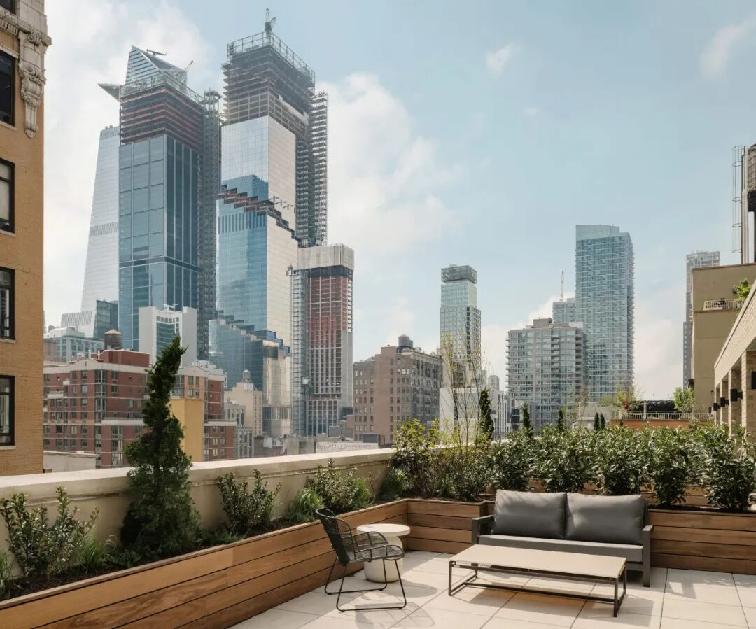 大堂屋顶露台上被种上郁郁葱葱的绿植,客人可以在这里欣赏到曼哈顿天际线的广阔景色。