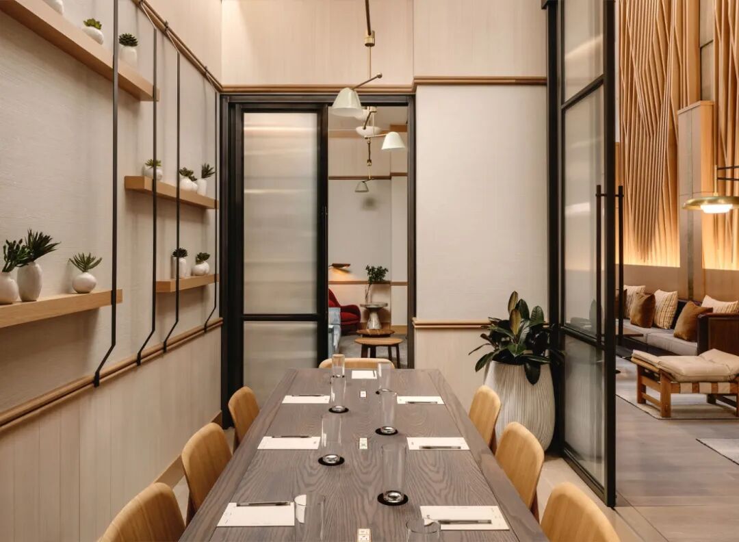 中庭木饰面高墙的对面是几个连在一起的相对私密的休息室,也提供用餐空间。