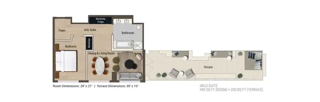Arlo 套房,45.5㎡室内+ 25㎡阳台,位于23层