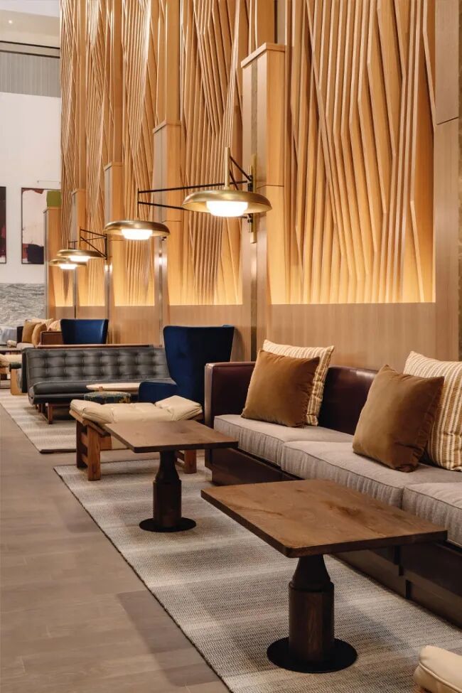 同样,受布料的启发,中庭休息室九层高的木饰面装饰,雕刻成类似于垂褶织物的波浪形状。
