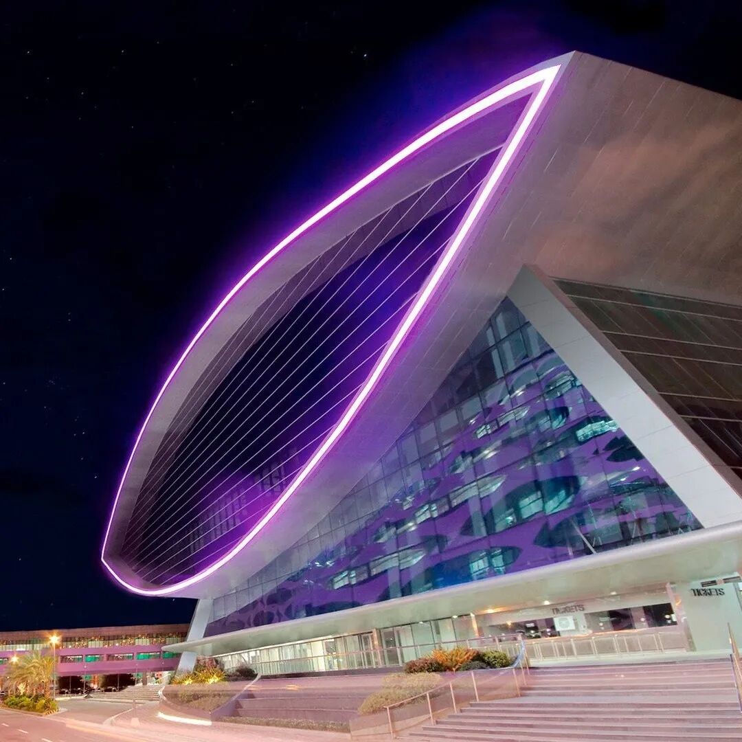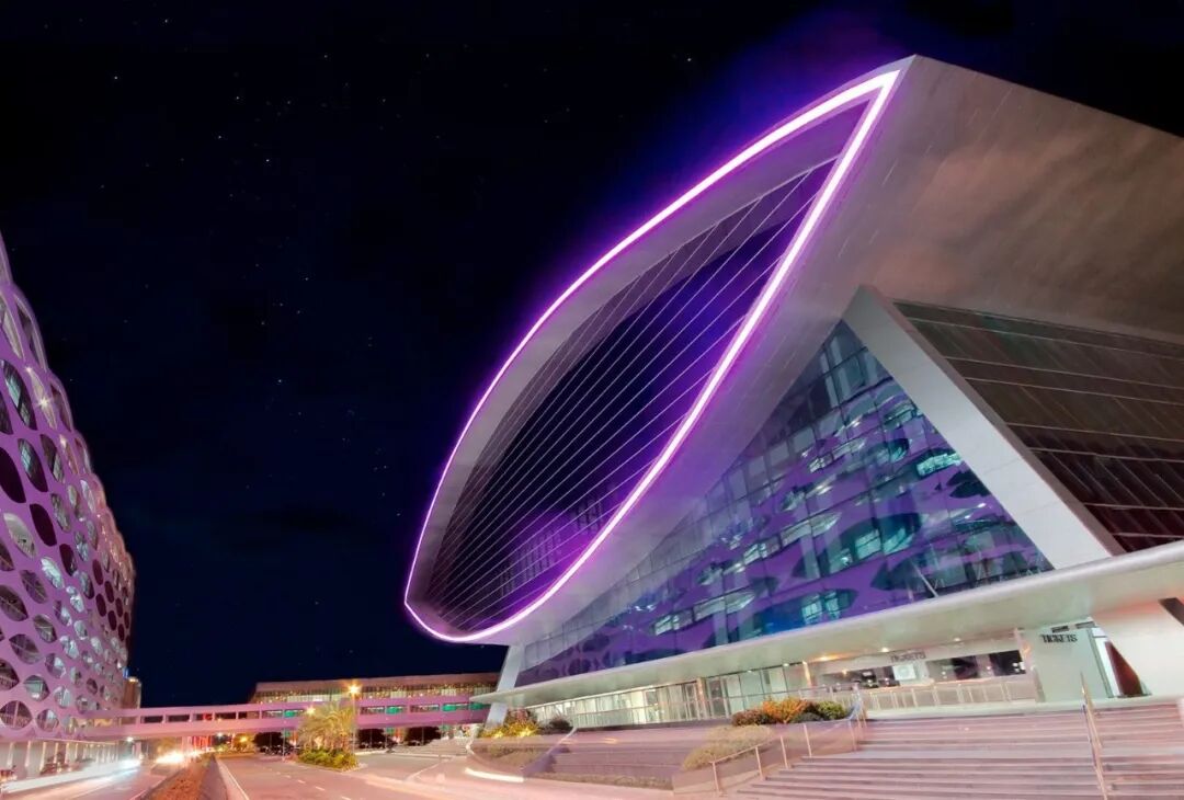 白天,大面积的玻璃幕墙捕捉着天光云影,随着天气的变换而赋予建筑不同的性格;到了夜晚,紫色的霓虹灯勾勒出“巨眼”的形状,建筑化身为一座灯塔,在数公里外依然光彩夺目。