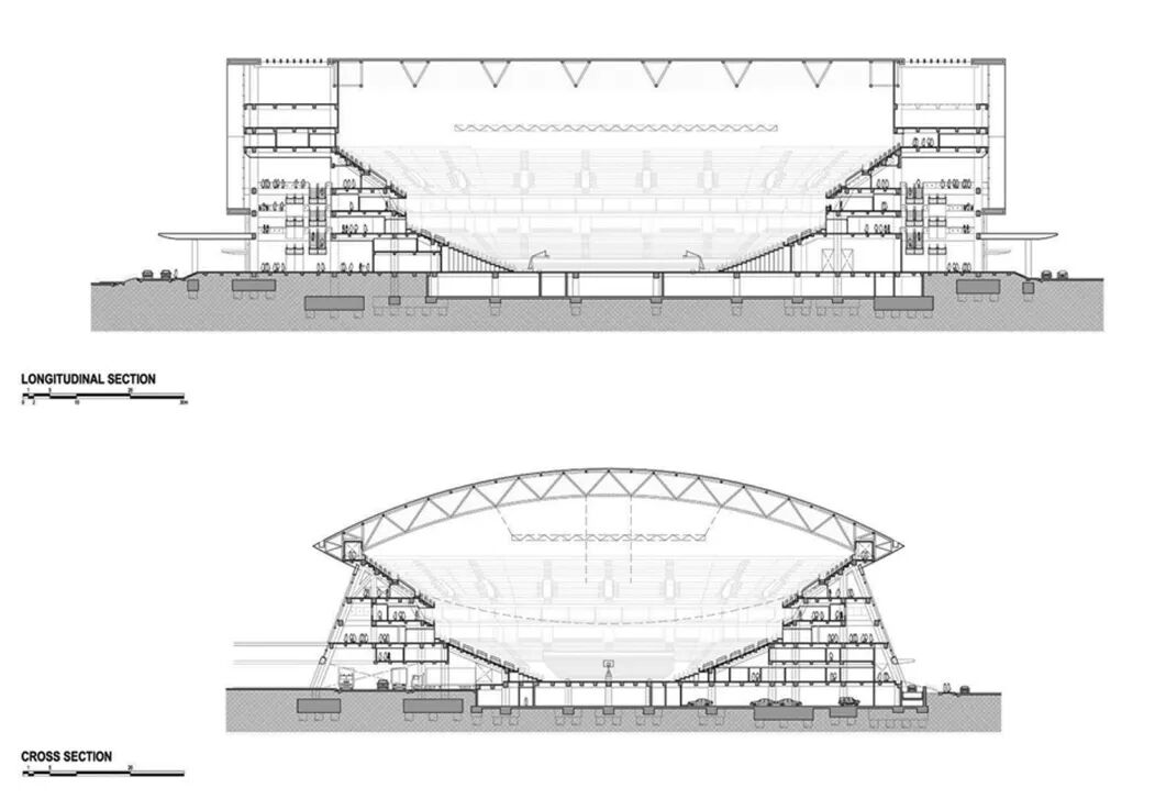 亚洲购物中心体育馆的设计起点,是在占地约4.6万平方米的场地上,建起一座可容纳大体量体育设施的巨型拱形屋顶,然后将其与另一个镜像对称的下凸拱形相结合,组合成一个标志性的尖角椭圆造型。