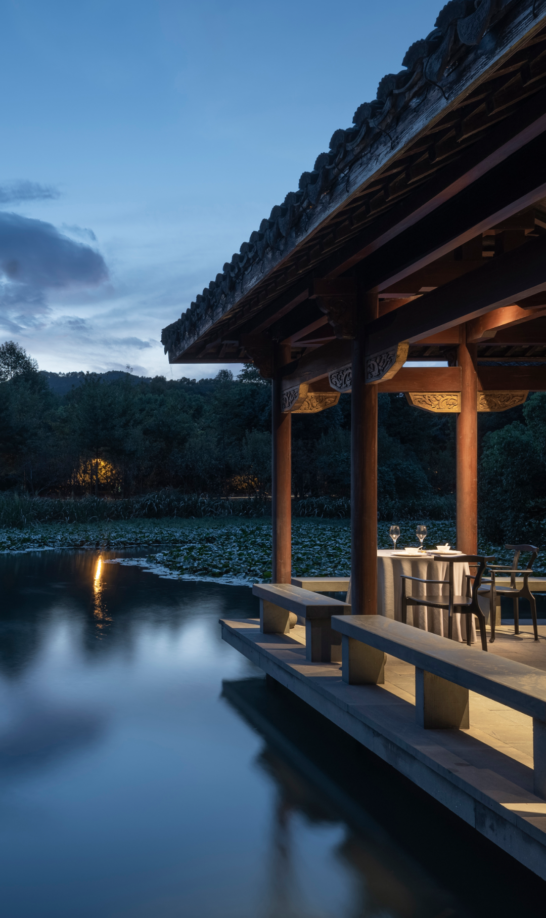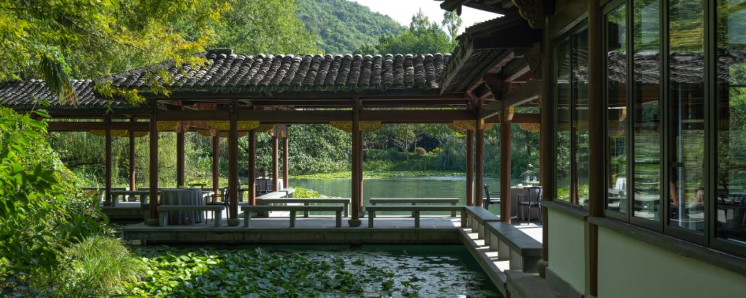 楼三面洒吹风”,似乎直接置身于山林水畔,高雅的“不下堂筵,坐穷泉壑”文人山水画意境,增加室内外环境的相互沟通,还原独有的全景享受。自然与空间相互渗透,相互延展,身心沉迷于这优雅至极的亭台水轩。