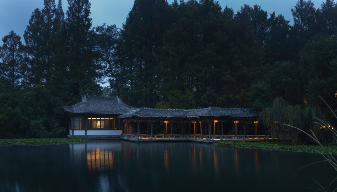它的名字与其相邻的“浴鹄湾”同音,后者是一片藏身西湖山水的悠然秘境。清风浮浮、落叶点点,它静卧于水面,屋脊的起伏简约秀美,如它的经历般曲折悠长。