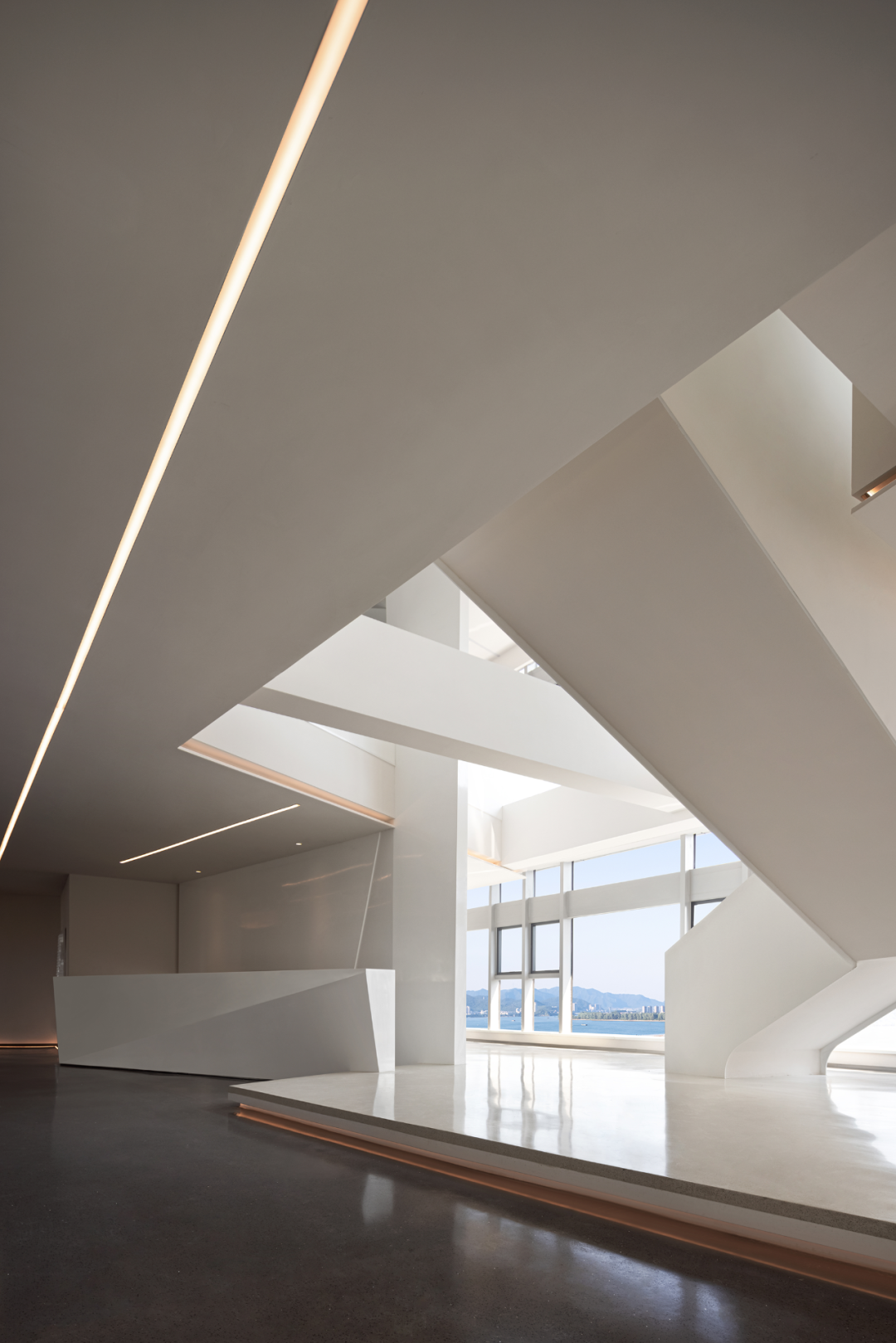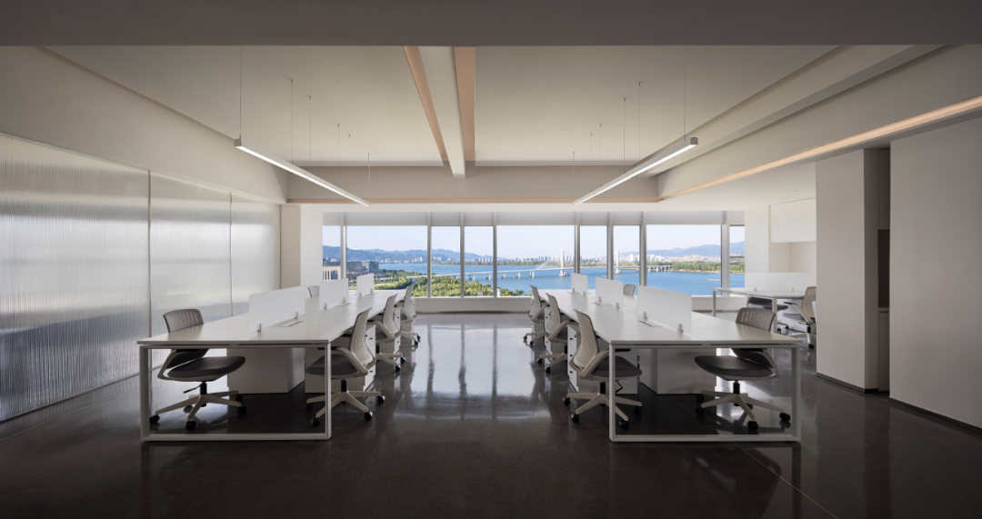 Xinshengda Group is located on the bank of Fuchun River, the base of whiteboard paper in China. The space design takes "paper folds" as clues, integrates architectural techniques into the interior, and creates a space like "white paper" with simplicity and purity.On the basis of satisfying the use, the complex and excessive decoration is abandoned, so that the space can reach the ultimate state, and at the same time convey the attitude and pursuit of environmental protection design.