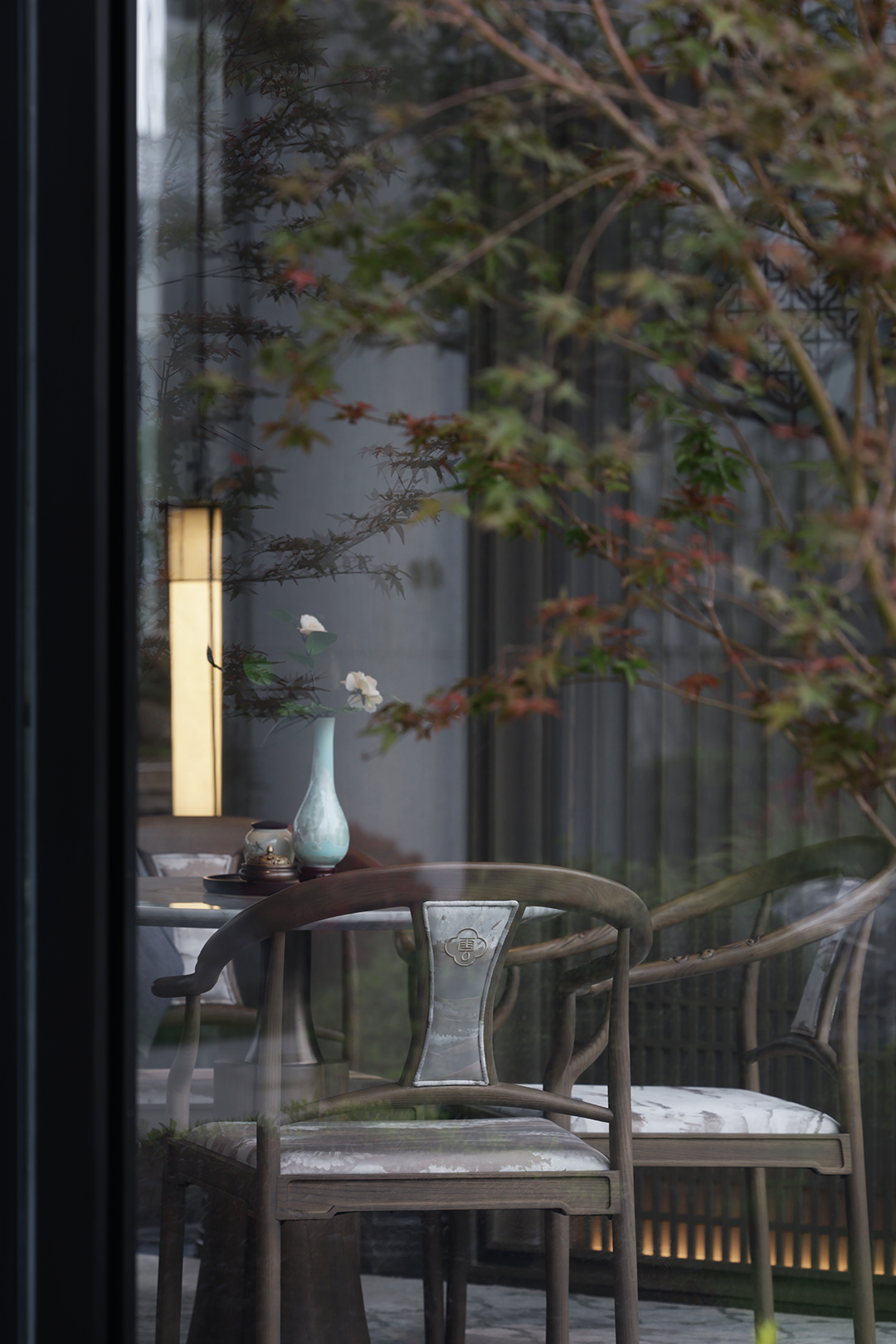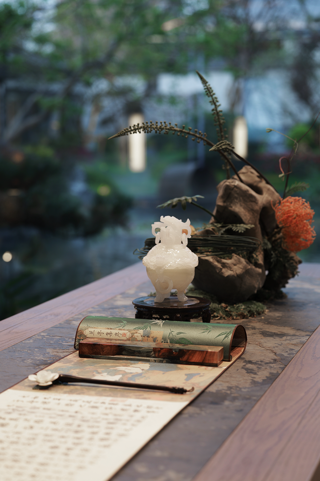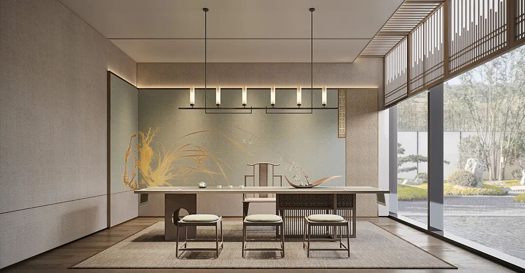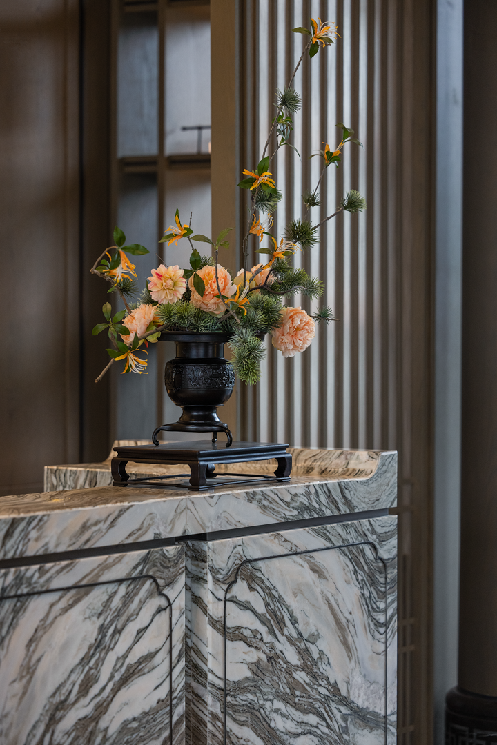 洽谈区贴合空间主题茶几和花艺;采用卢志荣的《石上生花》系列来诠释 ——《山茶花》,搭配宋式家具,营造家的真实感受和舒适商谈氛围,光影交错下,一面是开阔的园林丛林景色,一面是丰沛的情境体验,共生平衡与和谐。