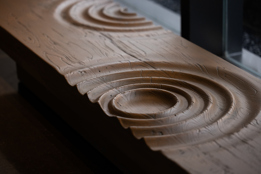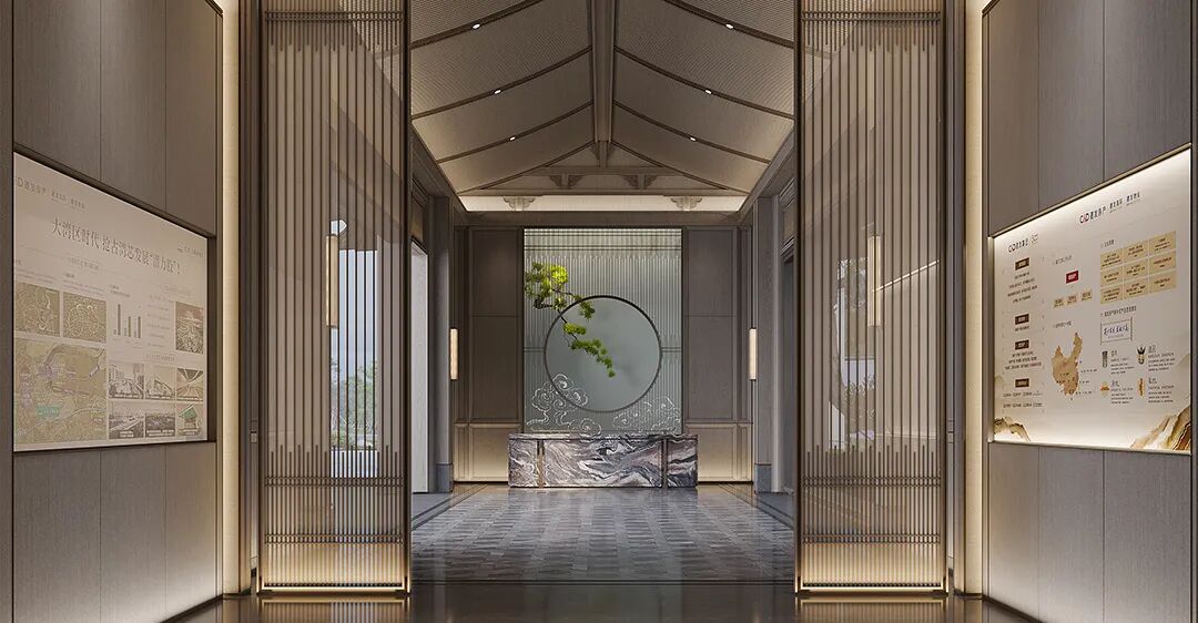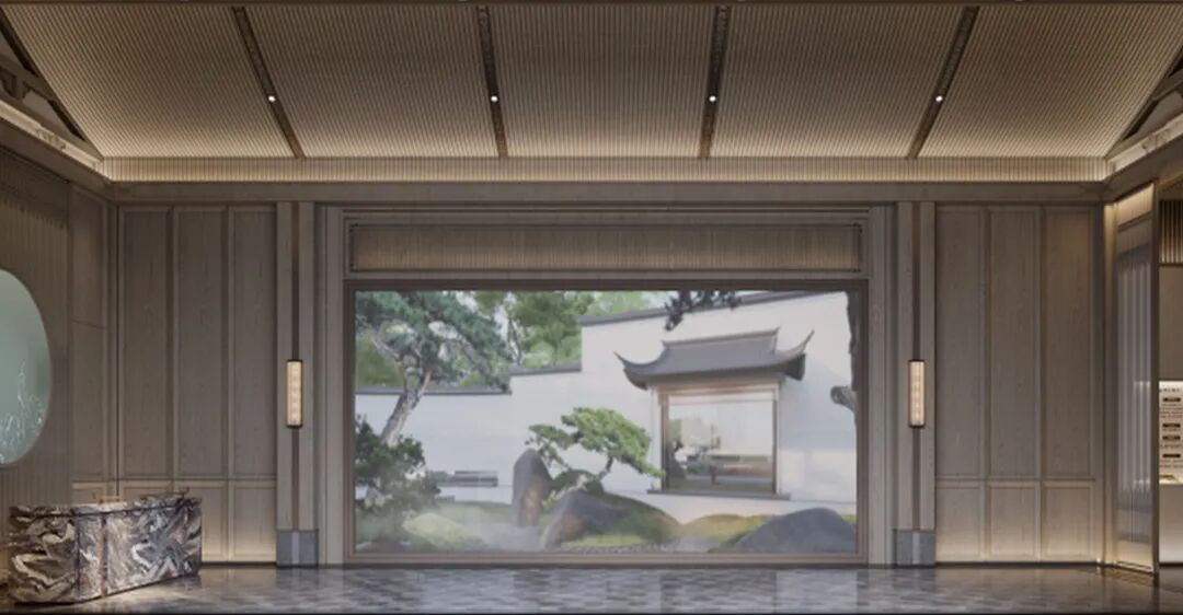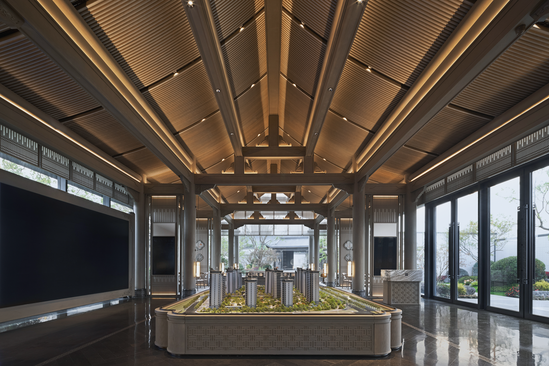 洽谈区贴合空间主题茶几和花艺;采用卢志荣的《石上生花》系列来诠释 ——《山茶花》,搭配宋式家具,营造家的真实感受和舒适商谈氛围,光影交错下,一面是开阔的园林丛林景色,一面是丰沛的情境体验,共生平衡与和谐。