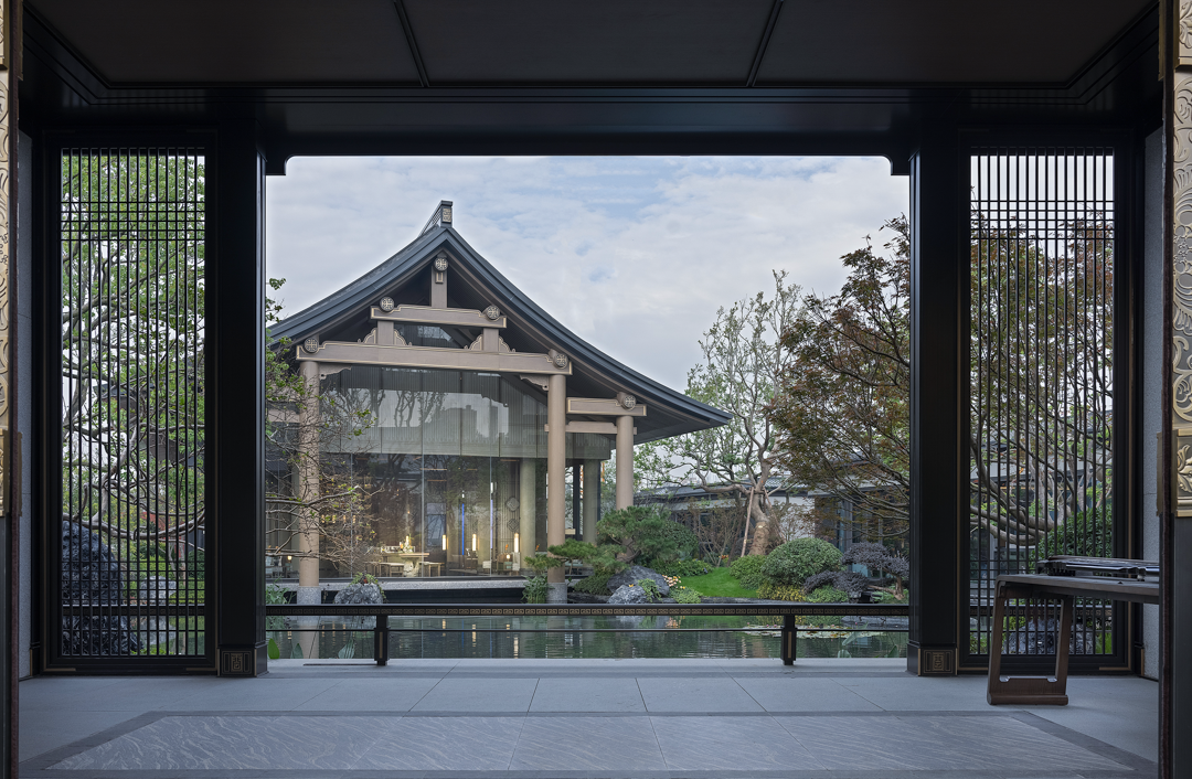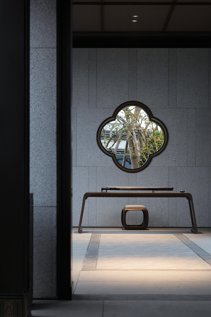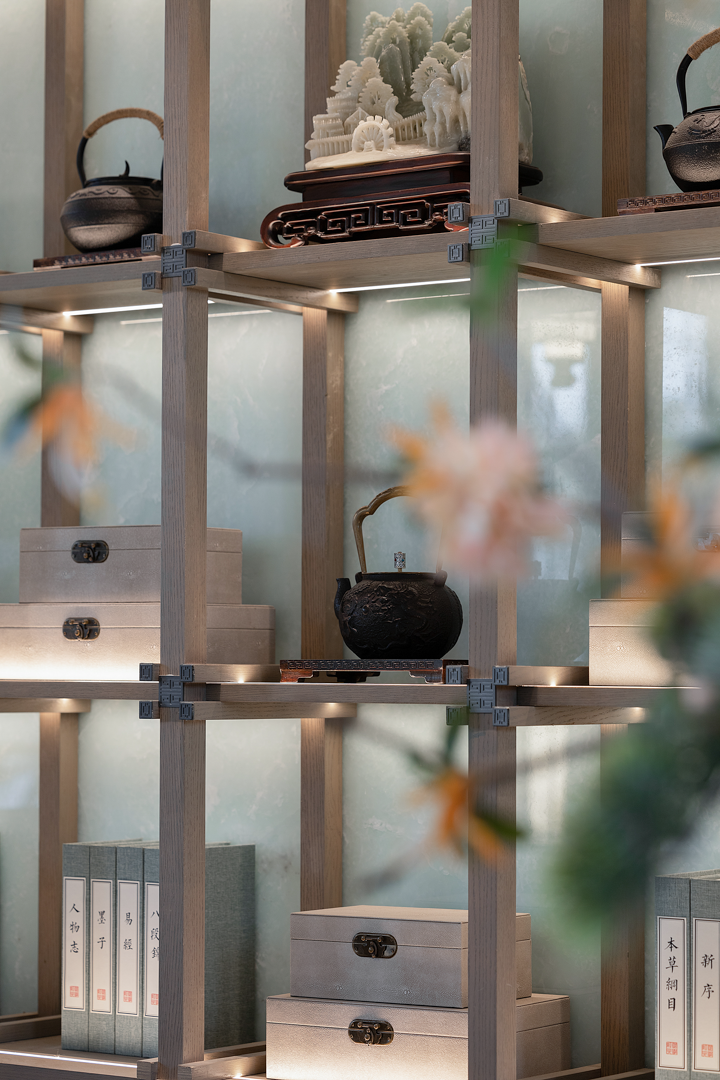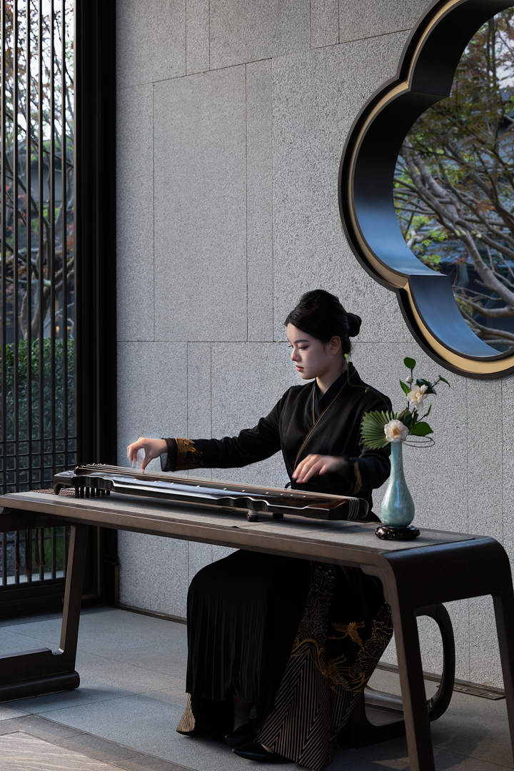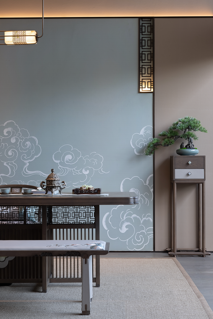 不同的空间其形式与意蕴不同,从空间出发,通过形制将有序的逻辑动线与纯粹的艺术品位得以重新定义。袅袅的琴音与山茶花元素照应,借墙外鸟鸣嘤嘤,古韵雅致,构成一幅“琴音花香伴鸟鸣”的诗意画境。