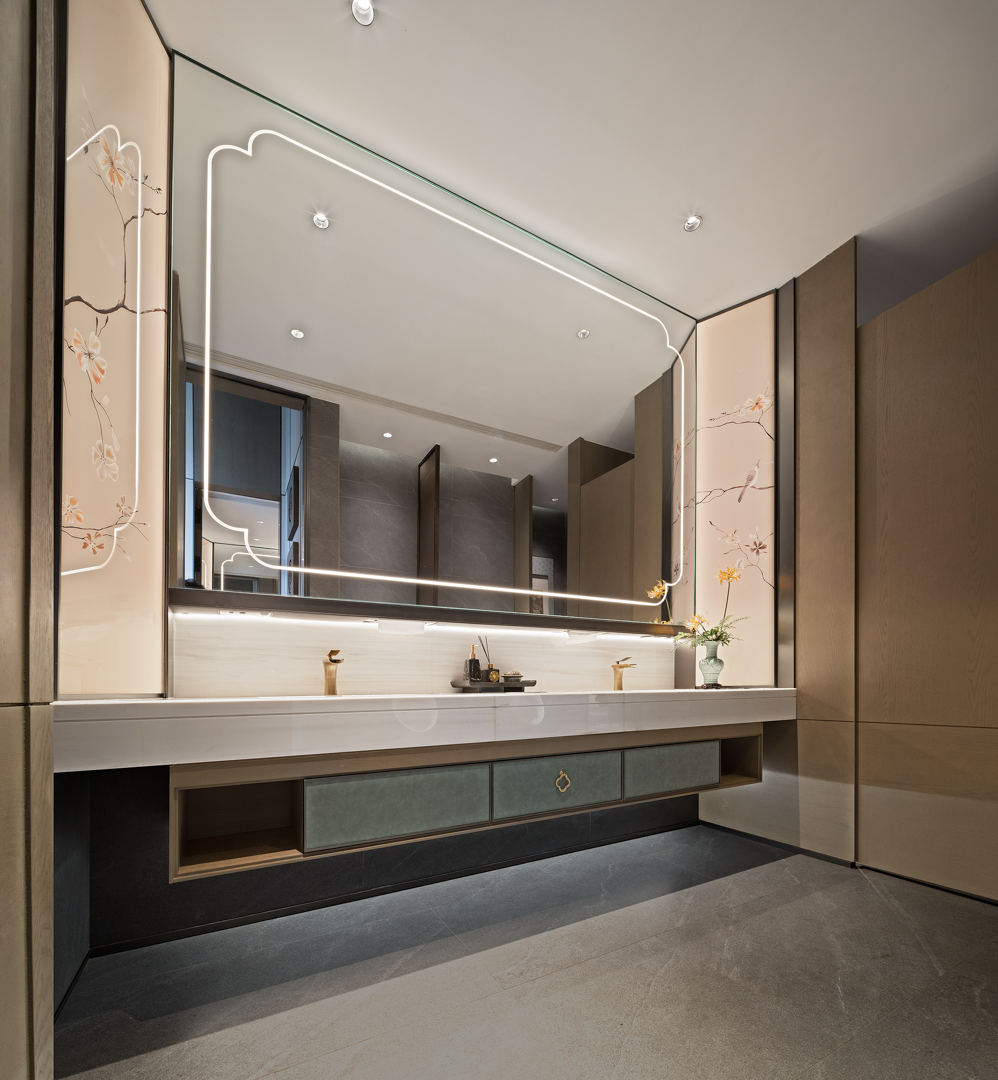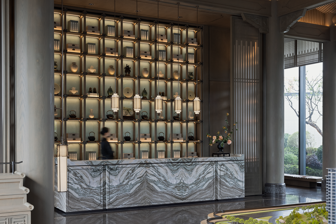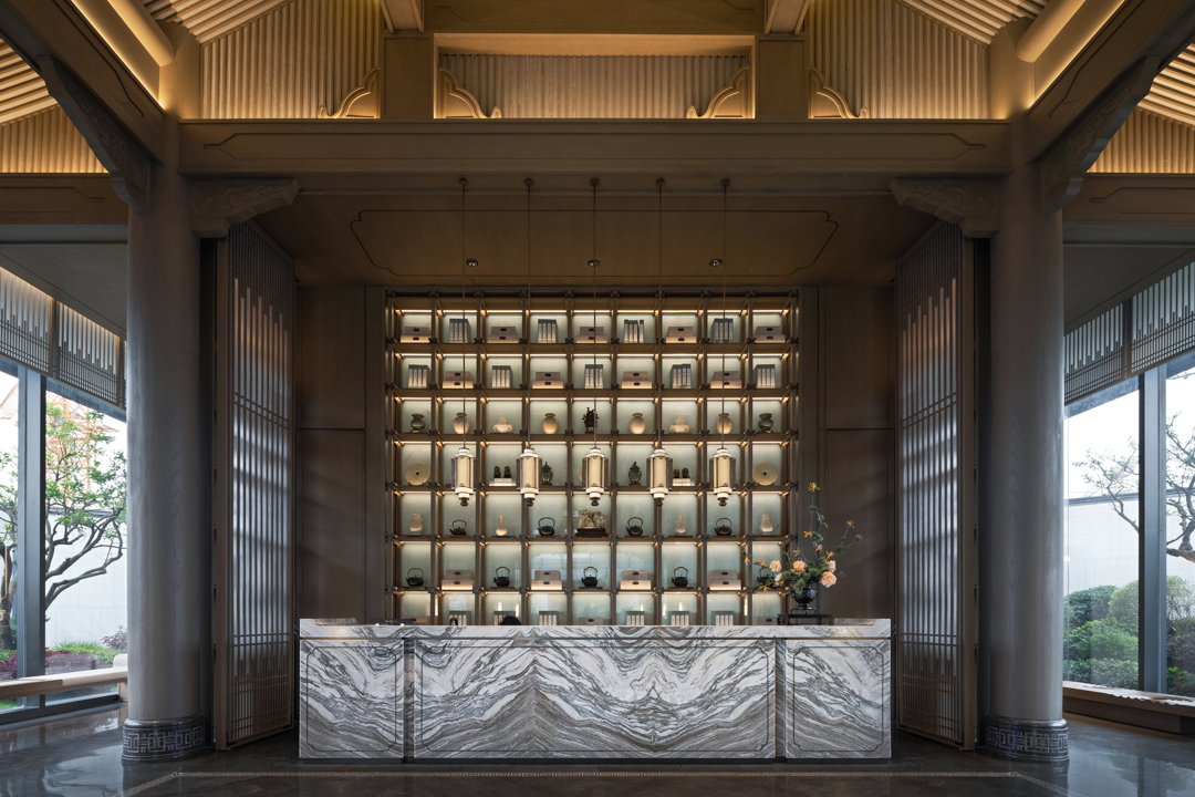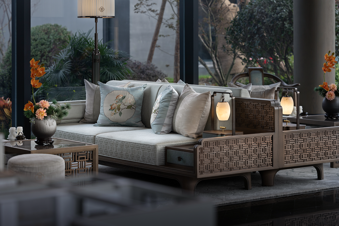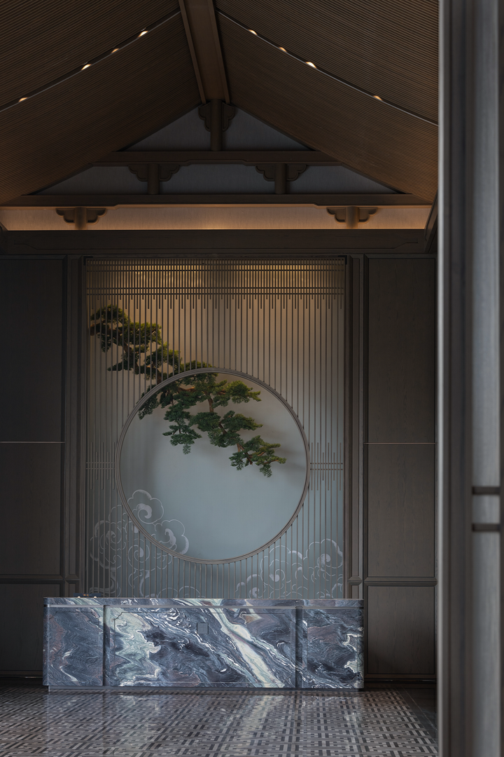 不同的空间其形式与意蕴不同,从空间出发,通过形制将有序的逻辑动线与纯粹的艺术品位得以重新定义。袅袅的琴音与山茶花元素照应,借墙外鸟鸣嘤嘤,古韵雅致,构成一幅“琴音花香伴鸟鸣”的诗意画境。