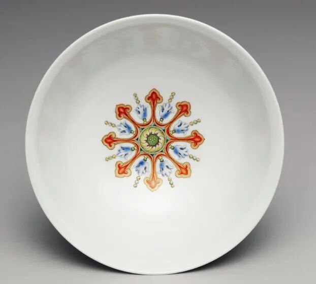 清宫膳碗延续了明代宫碗的经典式样,撇口,深弧腹,圈足,造型端庄稳重。