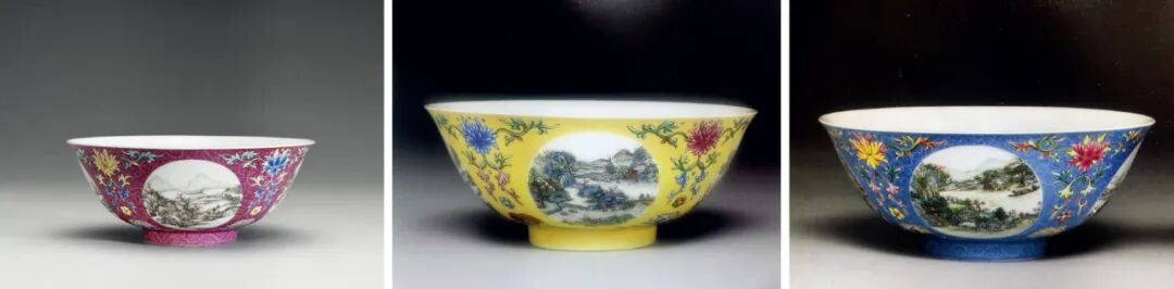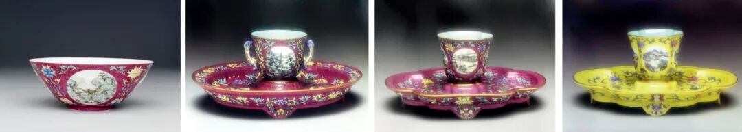 在御窑厂持续为内府所造器类丰富、华丽夺目的彩瓷中,有一类锦上添花(即轧道)四围(四团,即开光,亦有二团)画山水的汤碗、膳碗、杯盘,其外壁装饰式样一定程度上可视作节令膳碗的创作灵感来源。