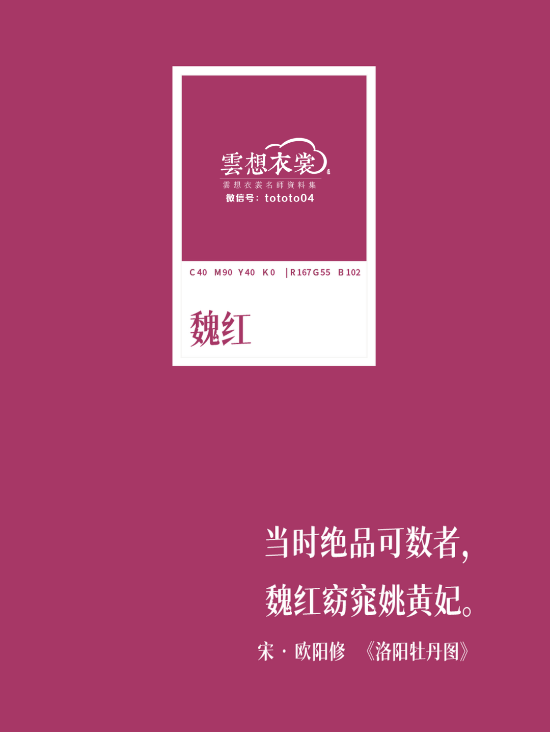 【色值】:C: 40 M:90 Y:40 K:0 | R:167 G:55 B:102