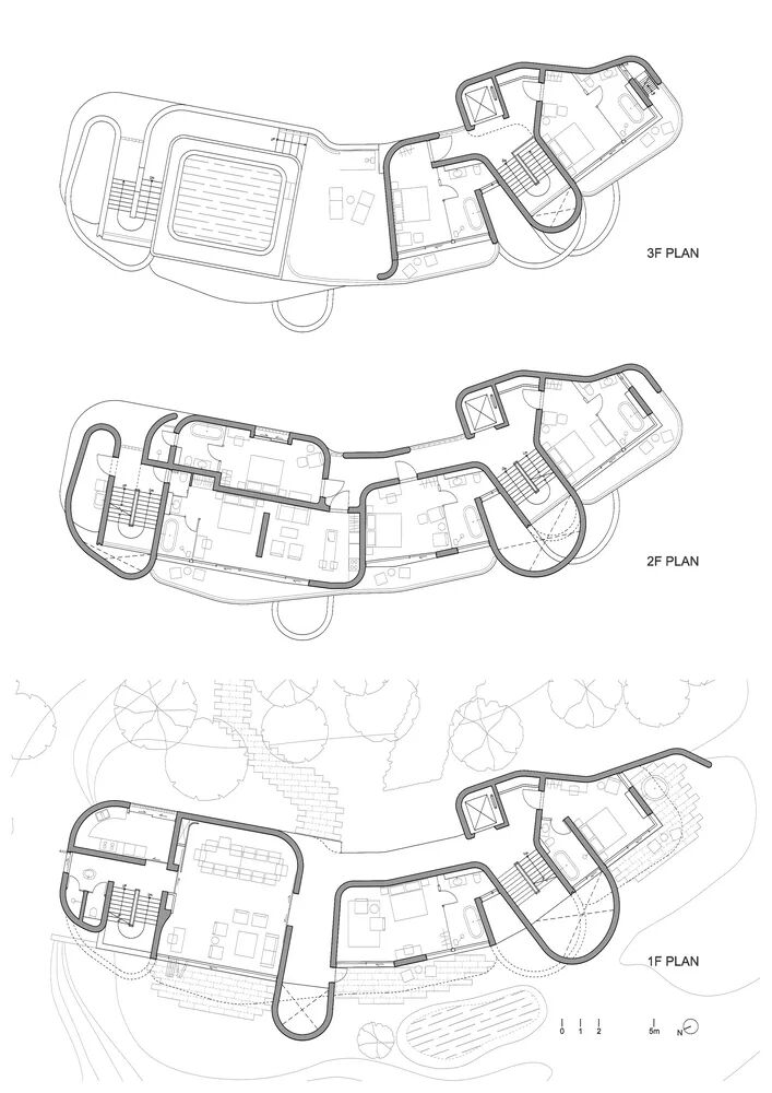 建筑仅用曲线的墙就定义了整栋民宿。蜿蜒于山林之间的墙既是结构、也是形式,既是室外、也是室内空间。