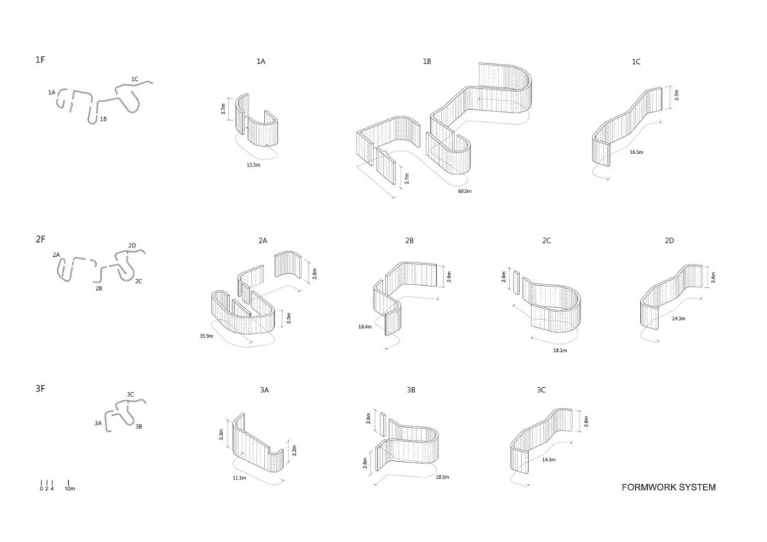 混凝土浇筑模板框架由回收的或粗糙的低等级木材在场地内现场组建,使用30厘米宽的面板构筑大曲度曲面墙壁,使用20厘米宽的面板构筑曲度小些的曲面,而以20厘米宽的木条构筑急转弯曲线。