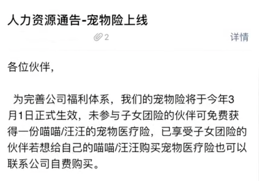 几天前,一家上海公司给所有员工宠物购买宠物险的新闻登上微博热搜,本着宠物也是家人的理念,开创了先例。