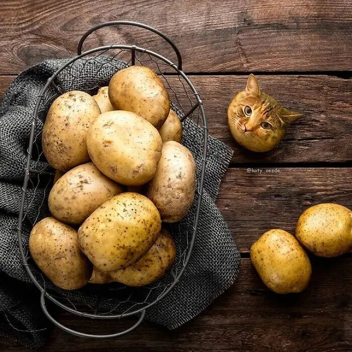 在加利纳·布加耶夫斯卡亚的作品中,长颈鹿、鱼、熊猫,甚至是土豆,都变成了一只猫的脸,或者猫的脸隐藏在这些物品中,虽然有些搞笑,但却没有太大的违和感,有的图片多看两眼,甚至都没有看出其中有什么问题。