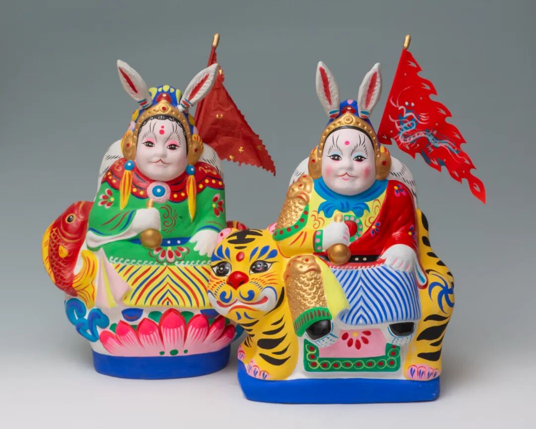 历史上过中秋节有祭月的活动,神话故事有嫦娥奔月之说。清代中期以后京剧在北京形成,剧中的大将威风勇猛,受此影响两个,旗籍差役以此做金甲红袍兔爷形象,后传于民间,艺人们丰富了其内容,有兔爷骑老虎的,有骑大象的,有骑鹿的,还有在莲花座上的表示美好寓意。过去百姓家都有供奉灶王爷,灶王奶奶的习俗,以后艺人又以此为参照,创作出成双的兔爷和兔奶奶。兔爷有后背只有一杆旗子,代表月光马,而不是武将的靠背旗。(白大成)