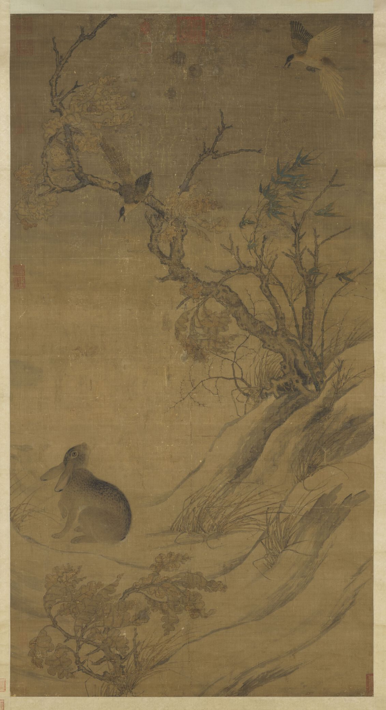 古代画家也喜欢选取兔子的形象入画。汉画中除与祥瑞和神仙有关的兔子画像外,更多地出现于狩猎图中,在猎人追逐下狂奔,是汉魏墓室壁画常见的题材。在平和的环境中,兔子更是画家乐于摹写的对象。在三国时期孙吴朱然墓出土的漆盘画《季扎挂剑图》下方,绘有二兔,前面的回首反顾,后面的紧紧相随,为画幅增添了几分野趣。宋代画家也有画兔的佳作存世,如崔白作《双喜图》轴。在辽宁叶茂台辽墓,出土过两幅目前中国古墓中发现的时代最早的装裱成轴的画,其中一幅是“竹雀双兔图”,图中竹丛、野花、双兔、麻雀相映成趣,反映出辽代绘画的风貌。