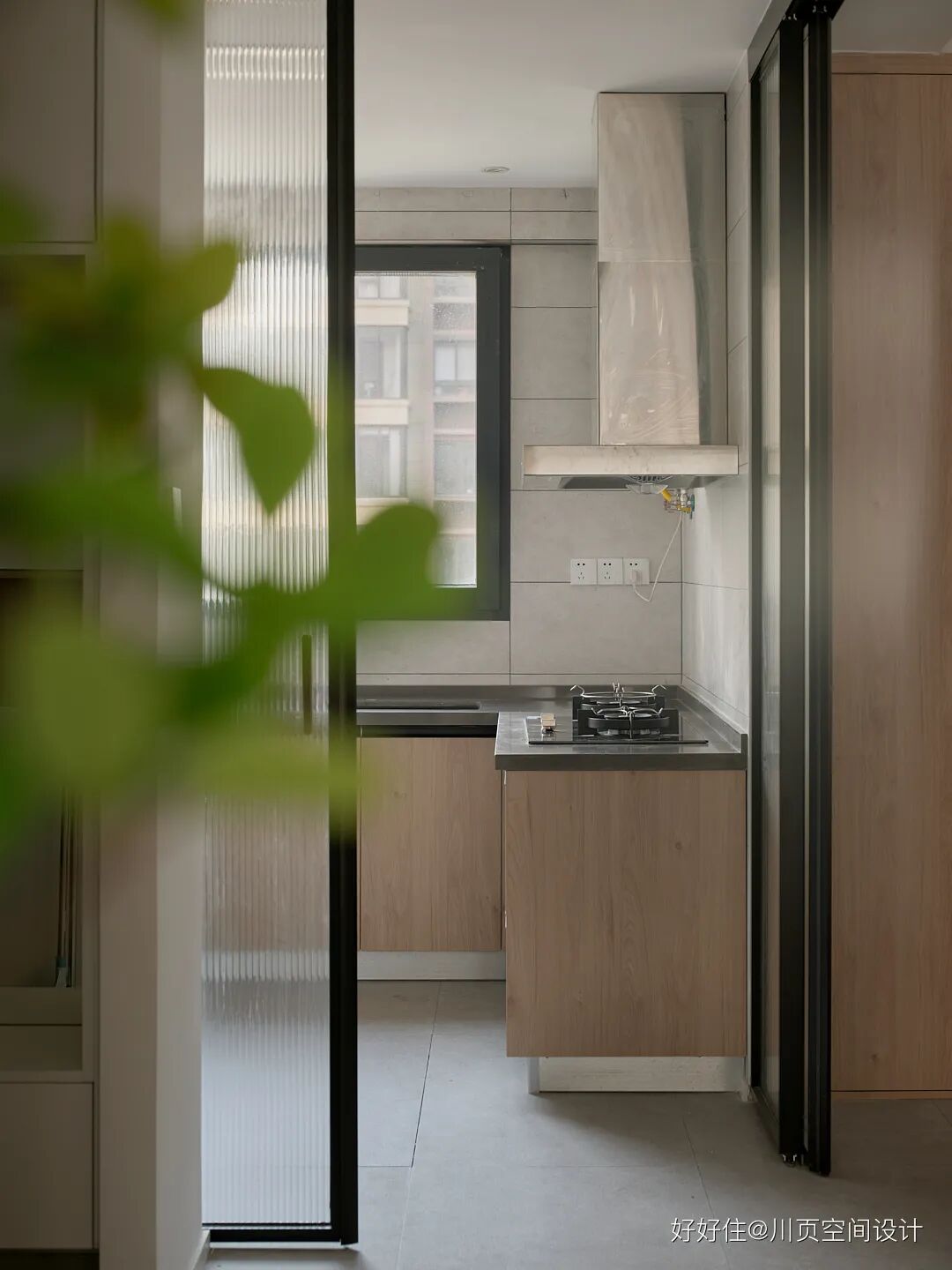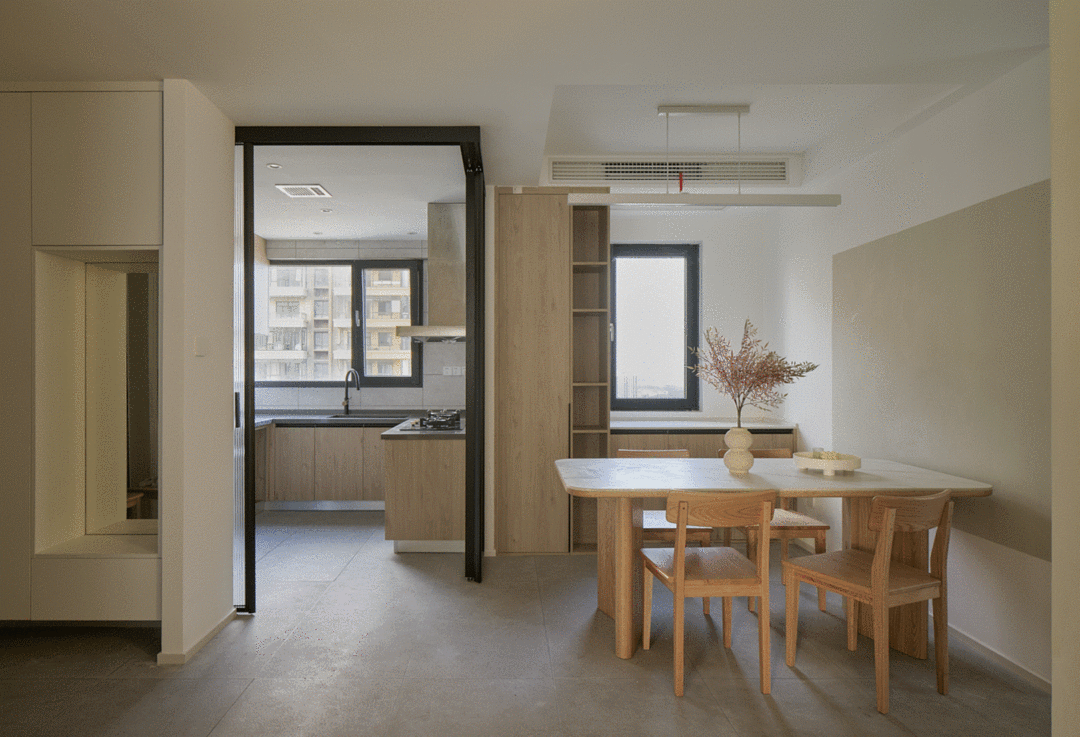 川页空间设计:厨房与餐厅之前的墙体打掉换成了吊柜移门,平时将厨房的移门打开,形成了餐厨一体化。做饭时,合上两边的移门形成一个独立的空间,隔绝厨房油烟。