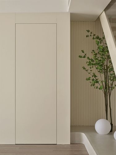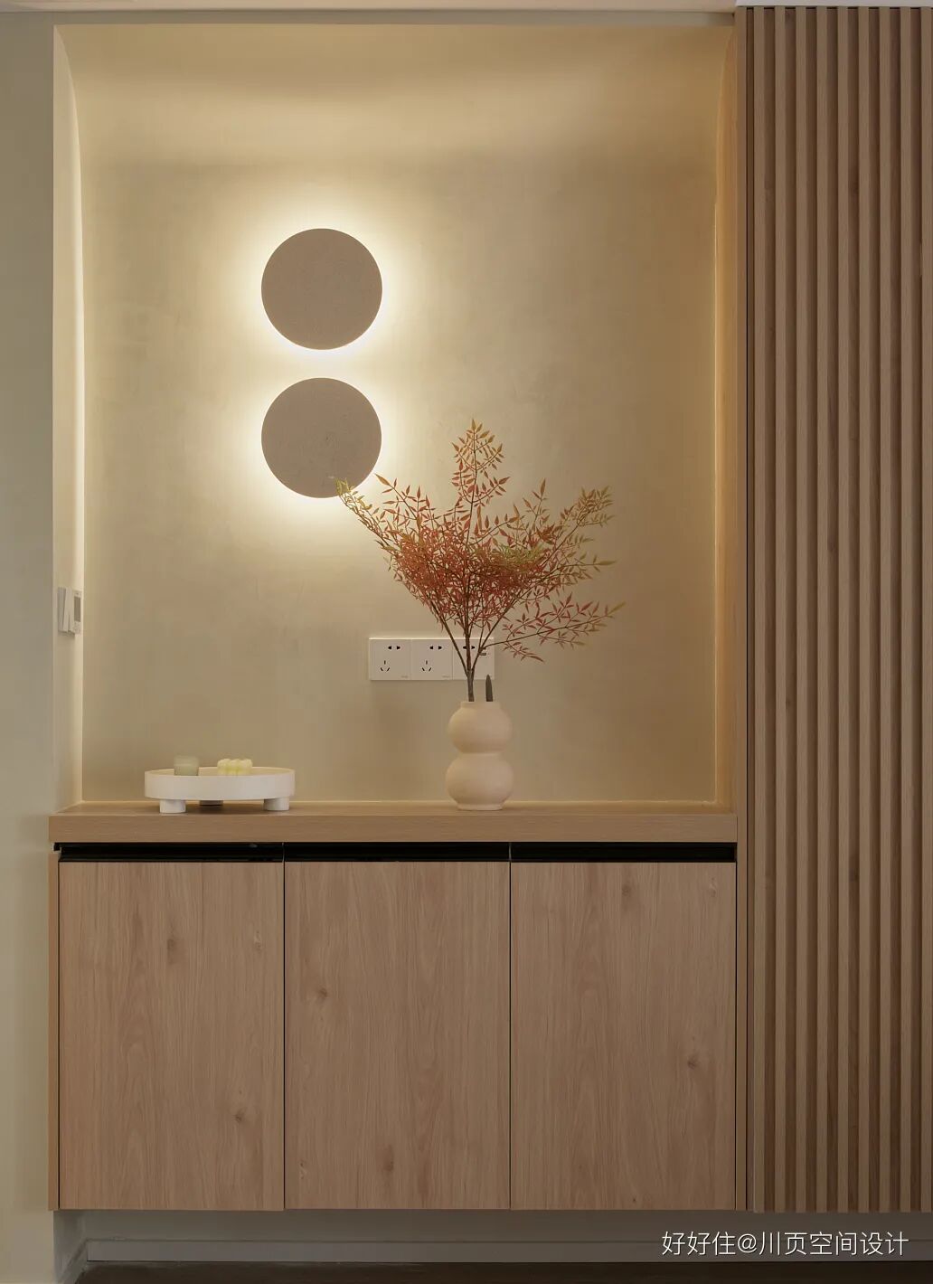 川页空间设计:墙面顶部做弧度造型,柔化空间轮廓,原木与艺术漆的相结合,给人浑然天成的柔和感。柔和的灯光,让整个空间营造出充满温度和柔软的氛围感。