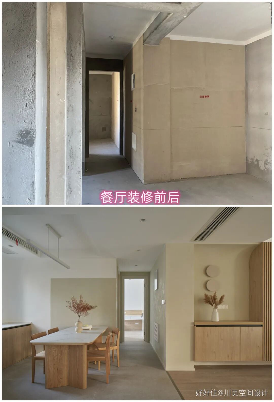 川页空间设计:餐厅装修前后对比图,将原来厨房与餐厅之间的墙进行了拆除,拆除后整个餐厅、客厅、厨房实现了零障碍沟通。