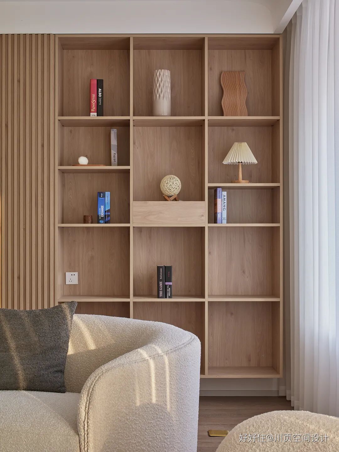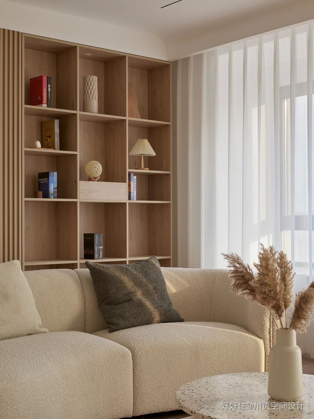 川页空间设计:考虑到一家三代居住的收纳压力比较大,因此前后背景墙都采用了收纳柜的形式,一边采用封闭式的收纳,一边用于摆放书籍和收藏品。因为客厅区域是挑高区域浇筑,为了拉伸客厅的空间高度,客厅前后背景墙的收纳柜采用了木质栅栏和线条修饰。